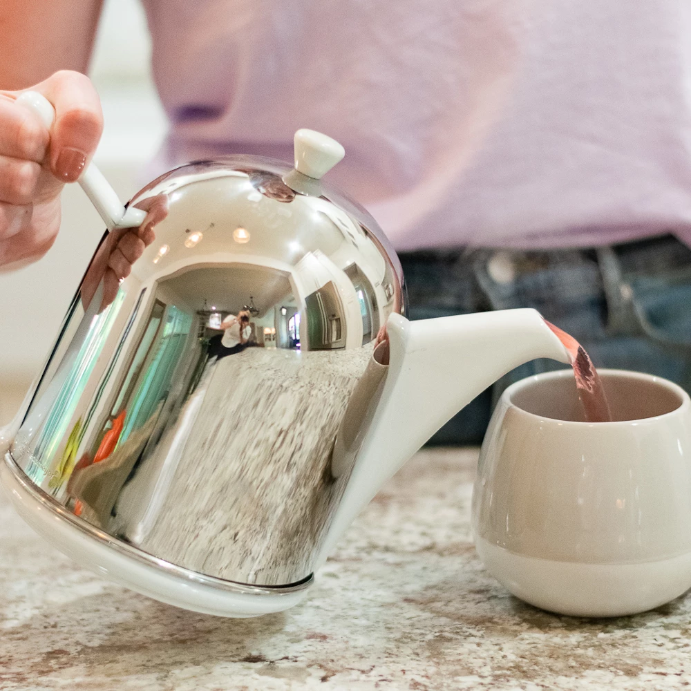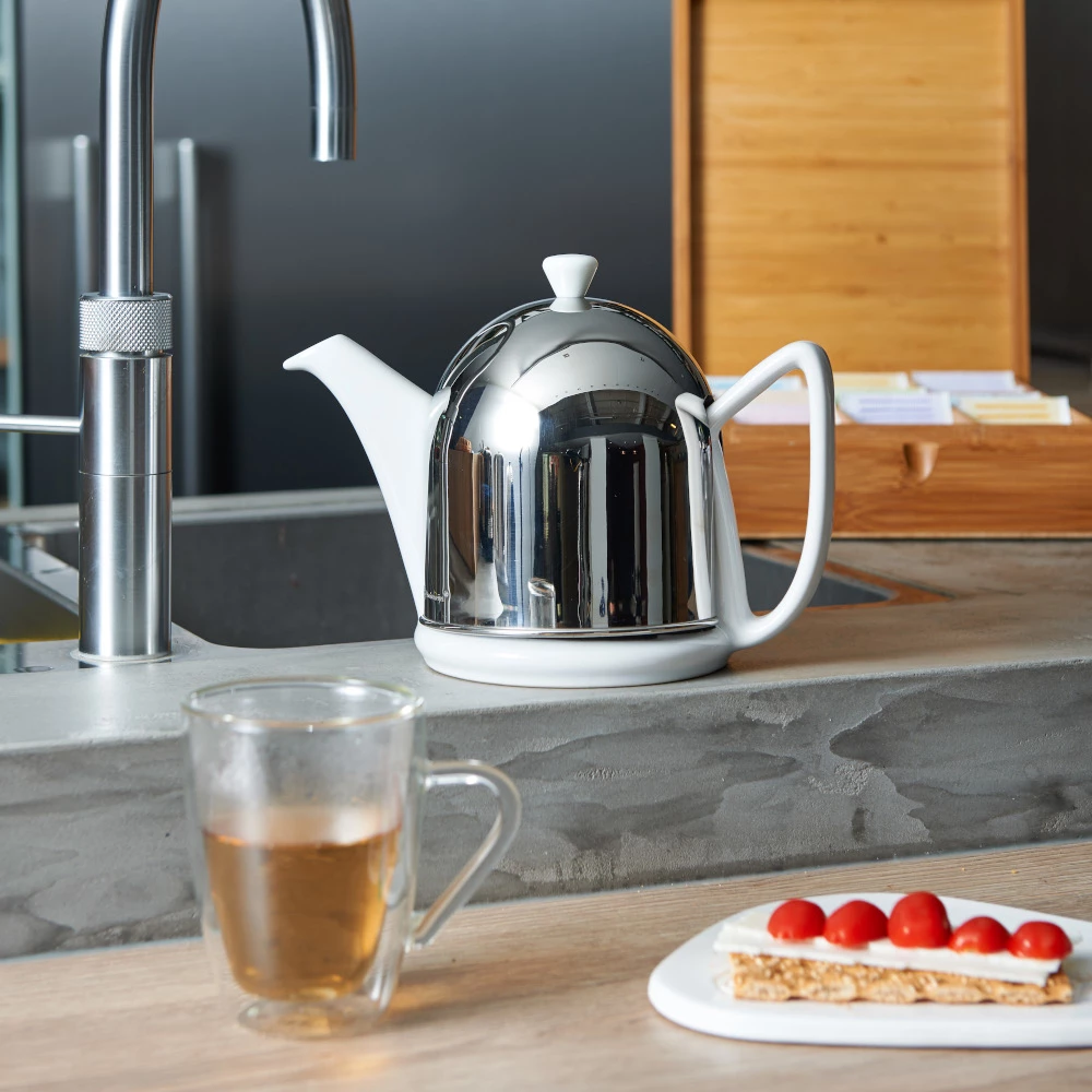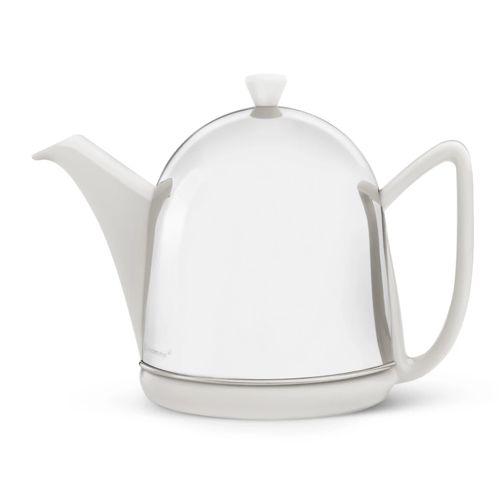 Our Manto Teapot in shiny Gloss White is a tall statement piece combining highly polished stainless steel with stoneware.