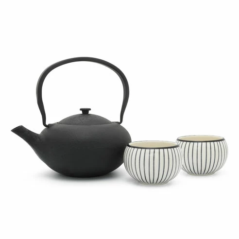 This cast-iron Teapot comes complete with two beautifully decorated porcelain tea cups and is presented in an elegant gift box. The interior of the teapot is enameled and it holds 1.0 litres. The teapot features a striped pattern and it comes with a stainless-steel tea filter.
