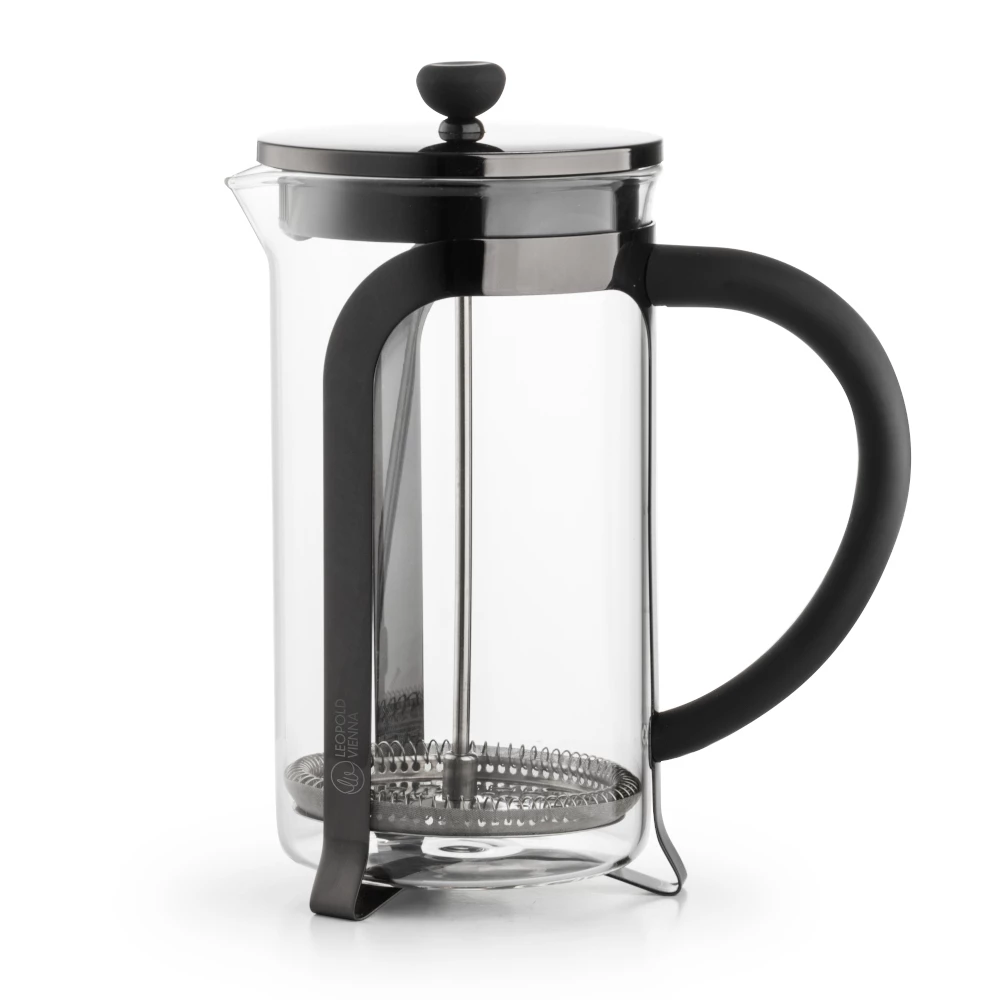 A Classic style Leopold Vienna coffee & tea maker in polished stainless steel and glass with gloss black body, lid and handle. Holds 1.0L which will serve 6-8 people depending on how you pour and the size of cup! L103xW174xH210 mm