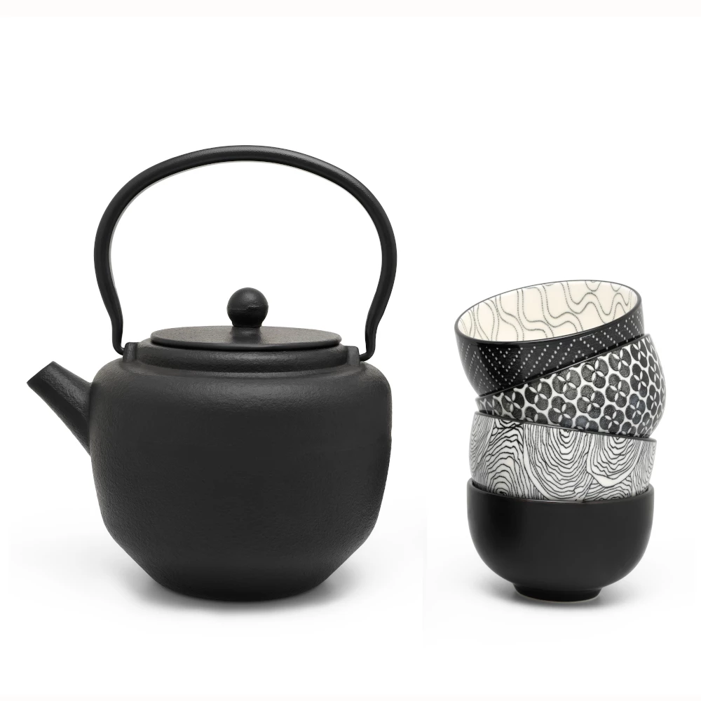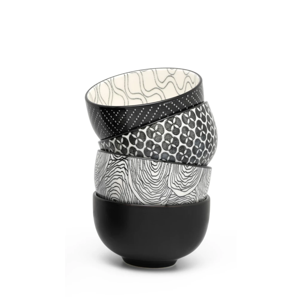 Set of 4 Tea Cups each with a different and attractive black and white abstract pattern to complement and matches the black Pucheng Teapot. The bowls are fully dishwasher safe and sized to be comfortably held in your hand. (Teapot shown in image not included!!)