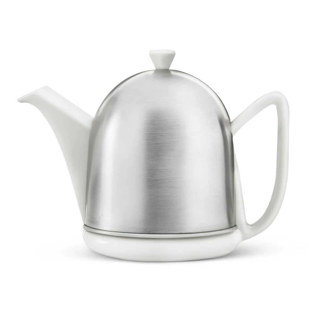Our Manto Teapot in Silky Matt White is a tall statement piece combining highly polished stainless steel with stoneware.