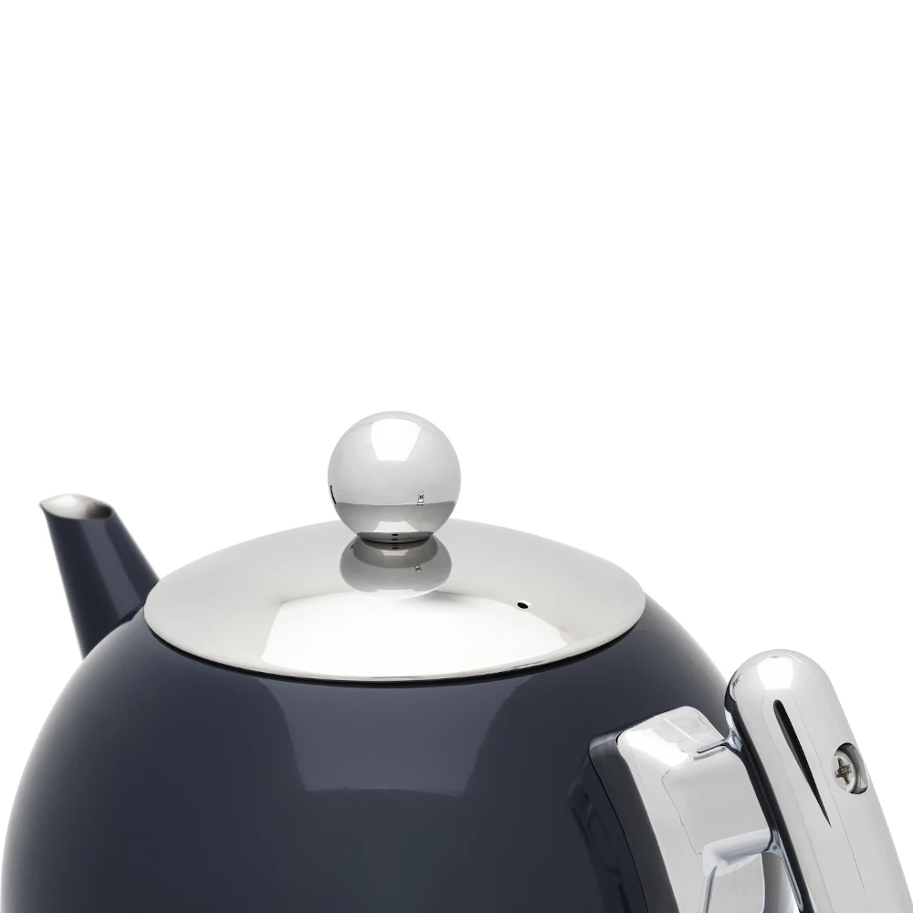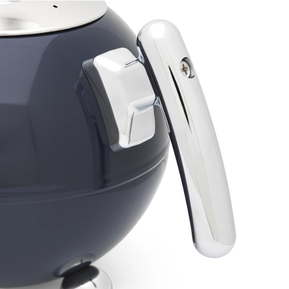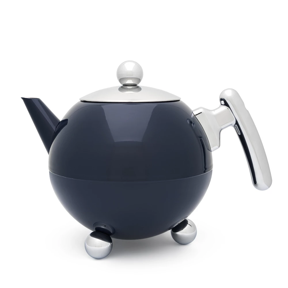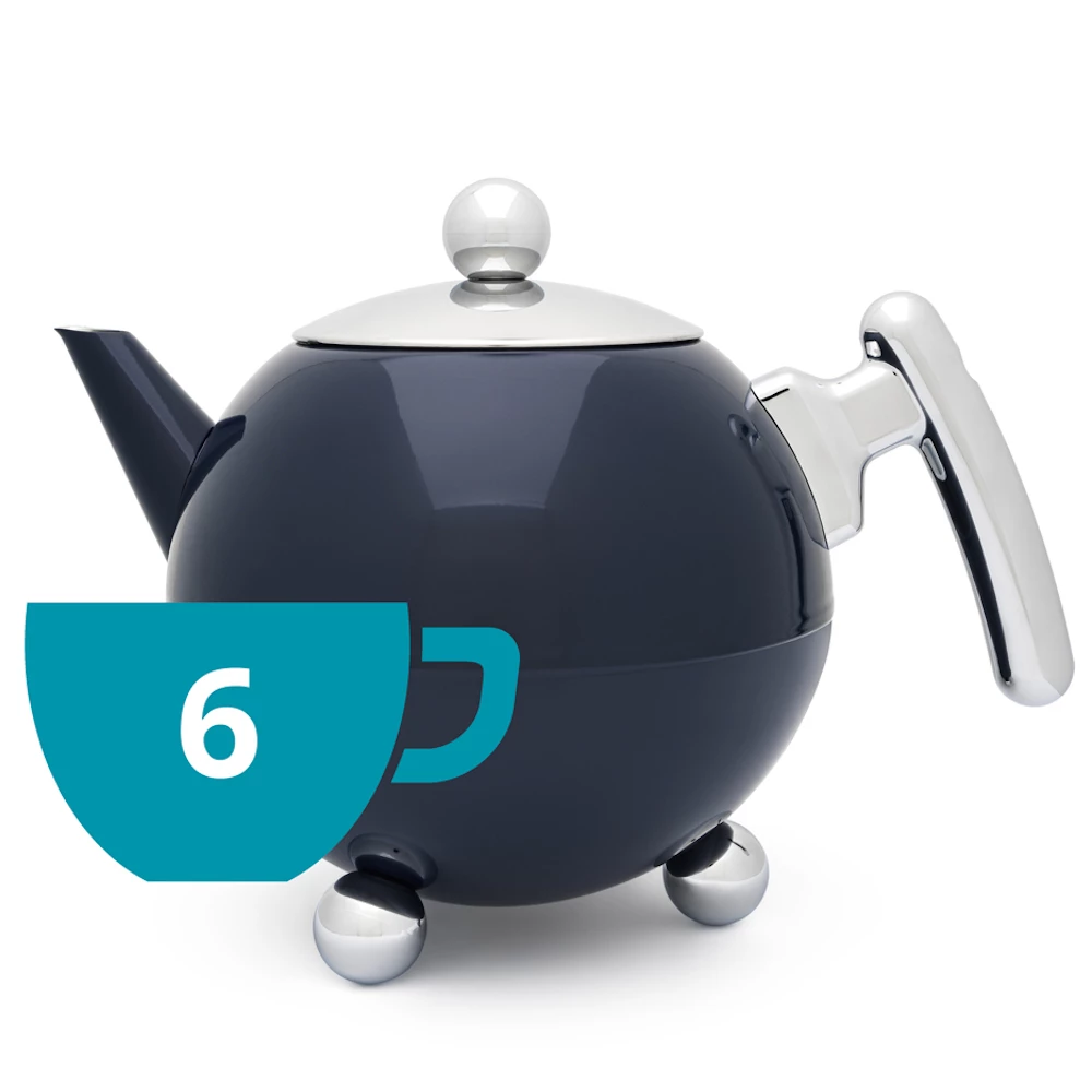 Bredemeijer Teapot Double Wall Bella Ronde Design 1.2L in Oxford Blue with ChromeSpecial Features…Double wall to keep hot for longer – up to 1 hourHandmade – 104 steps are needed to make a Bredemeijer double wall TeapotHigh Quality Stainless SteelHandle and lid knob will never get hotExcellent drip free pouringLarge volume capacity 1.2L