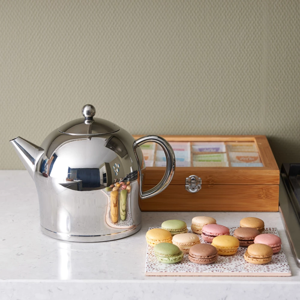 Our Santhee Teapot starts at the base with a smooth upright wall slowing turning into a slightly bulbous rounded top to create an extremely harmonious and tactile shape. Constructed of the highest quality brushed satin finish stainless steel it holds 1.0L (1000ml), approximately 6-7 150ml teacups of tea. (note a Mug contains around 350ml, twice or more of a Teacup!)There are no hard rules for sizes and Teacups can of course vary plus it depends on how you pour! As a guide an average Teacup is said to contain 150ml when filled to 1.5cm of the rim. Thus Teapots sized up to 0.6L pour 3-4 cups, up to 1L 5-6 cups, up to 1.2L 7-8 cups, up to 1.5L 9-10 cups and our largest 2.0L 12-13 cups. If in doubt check the size of your Teacup first and remember with a Mug you will get half the number of Cups!