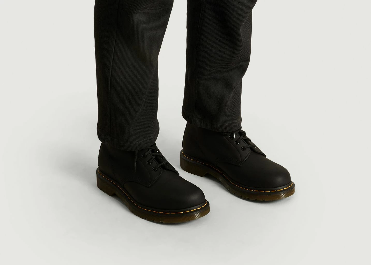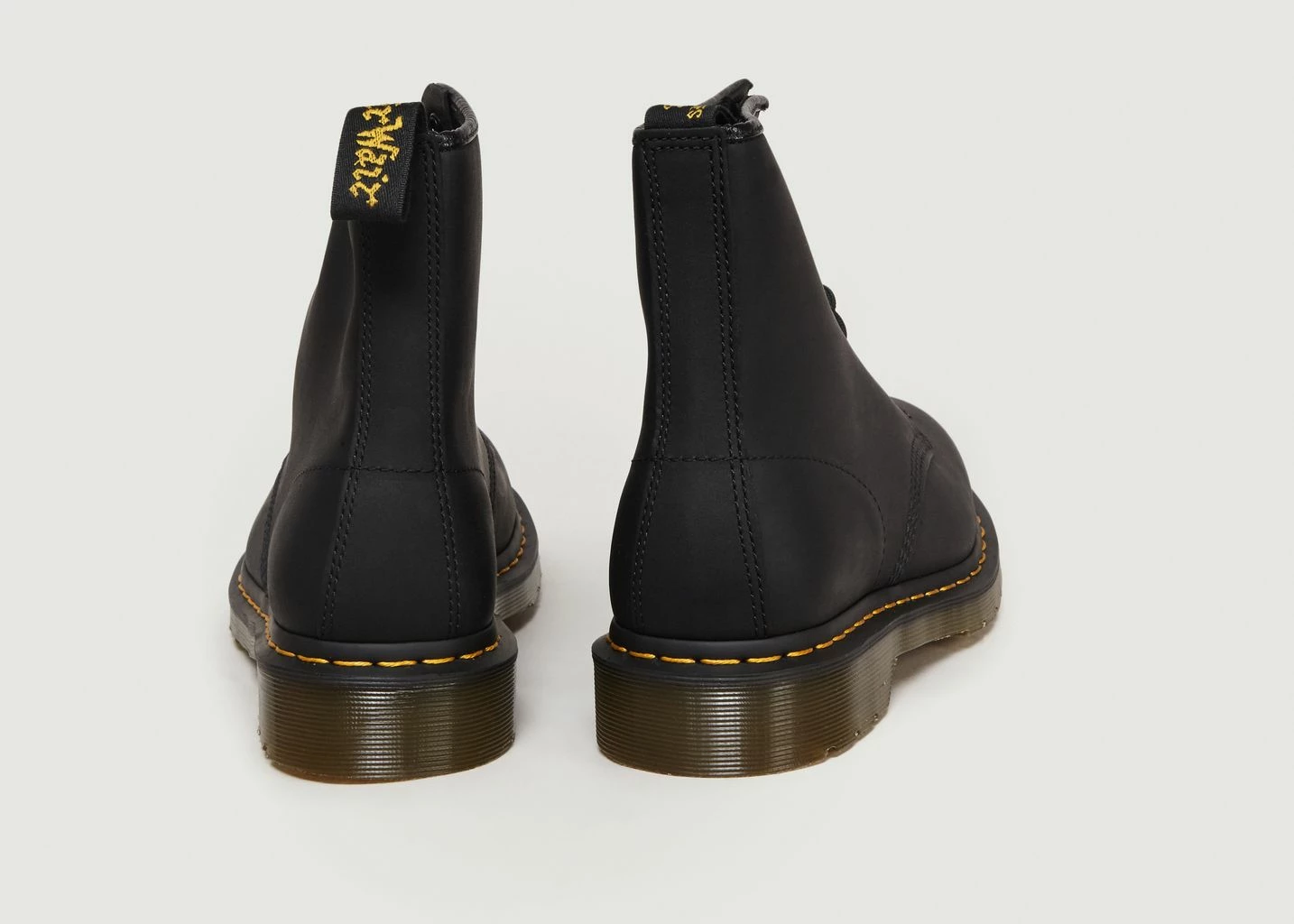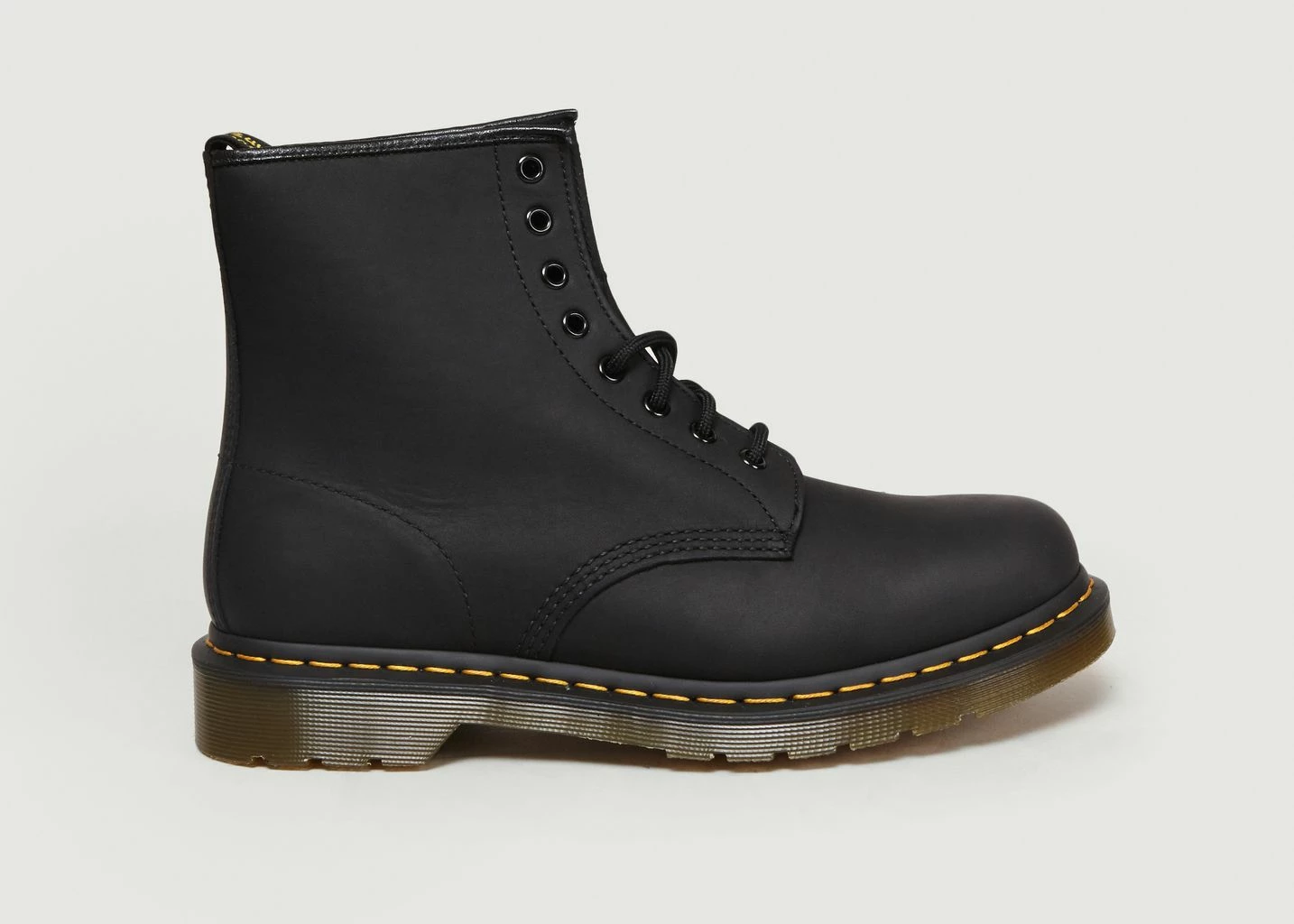 Black matte leather boots with oiled finish, contrast lace-up closure, leather lining, canvas footbed, 2cm heel height, 15 cm upper, ergonomic heel tab, Goodyear reinforced stitching, rounded toe, chunky tread non-slip sole. Founded in 1946 by Klaus Maertens, the 1460 is an iconic silhouette from the core British bootmaker. Renowned for its hardworking construction and versatile styling potential, each pair is crafted to the same high-quality specifications – using robust leathers and industrial Goodyear welt construction to ensure they last a lifetime. Seen here in a ‘greasy’ black leather, these chunky tread boots make the perfect ally for everyday wear thanks to their water-resistant topstitching and durable design feature.