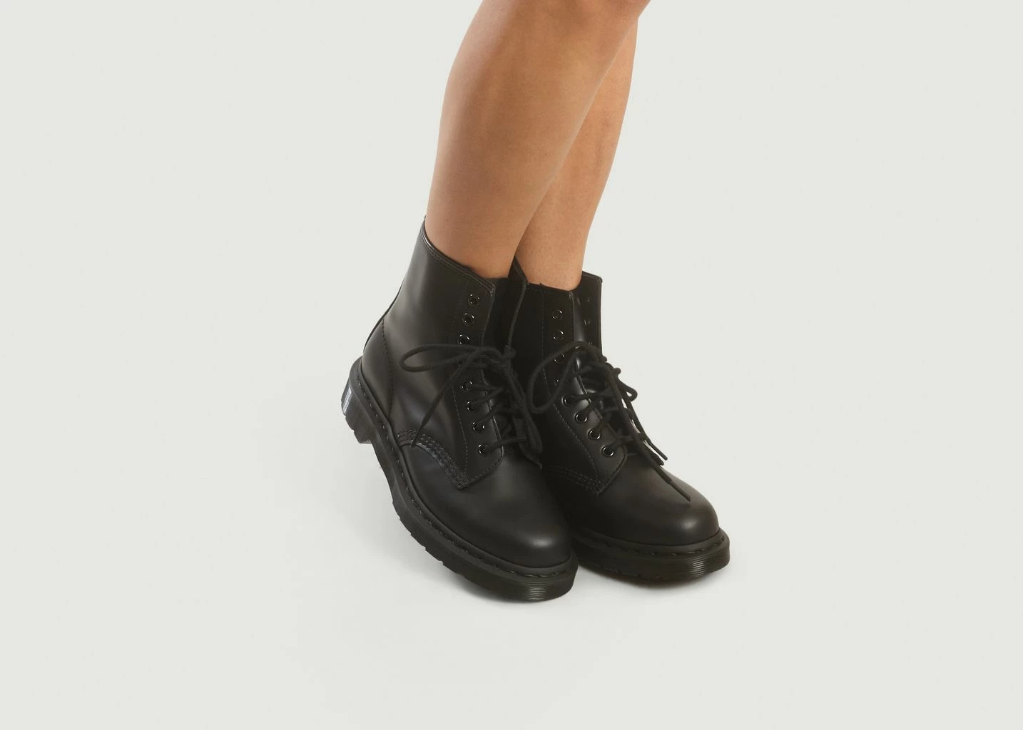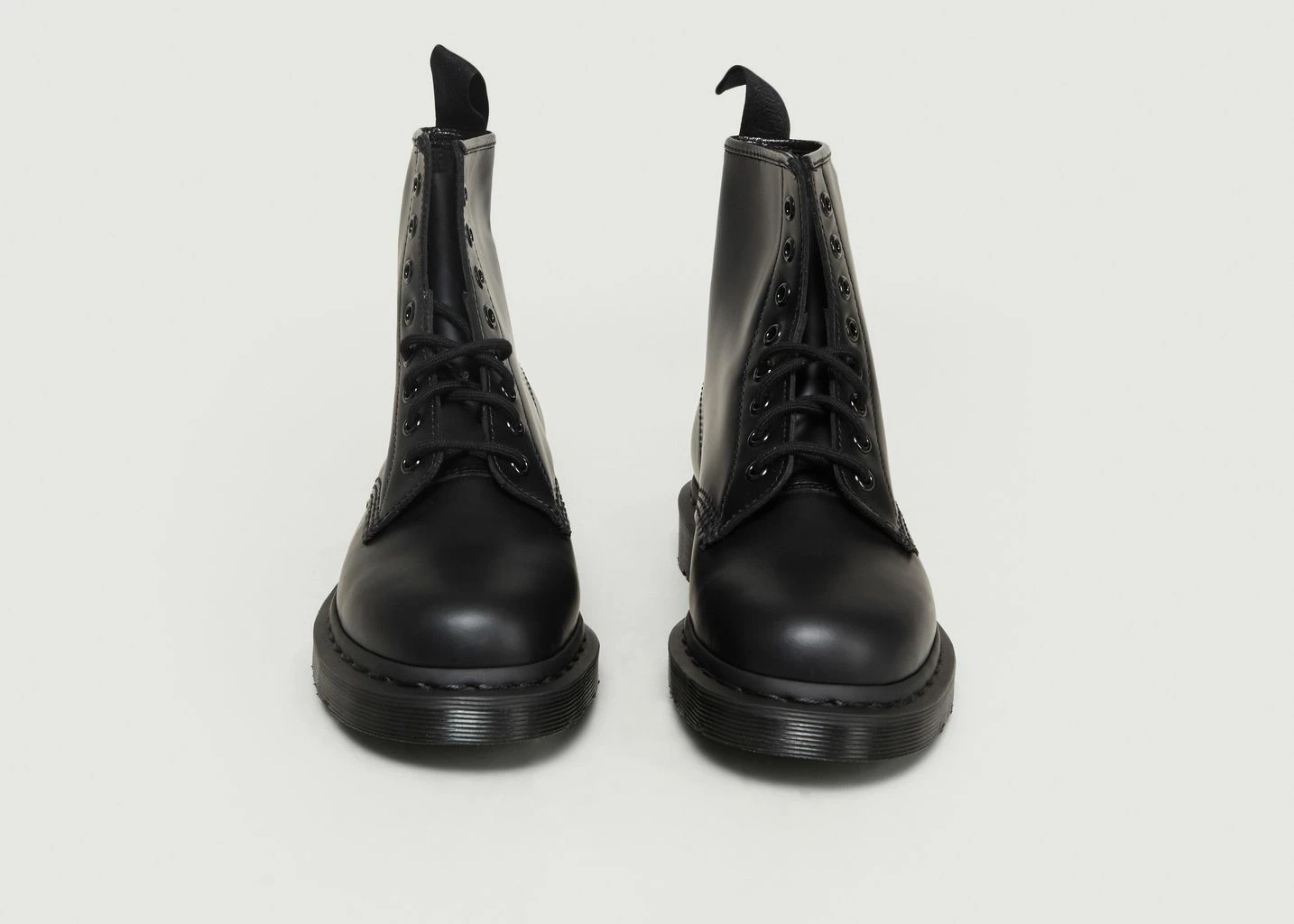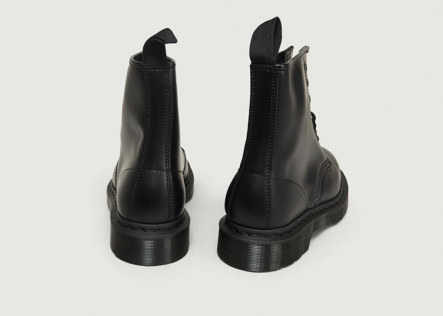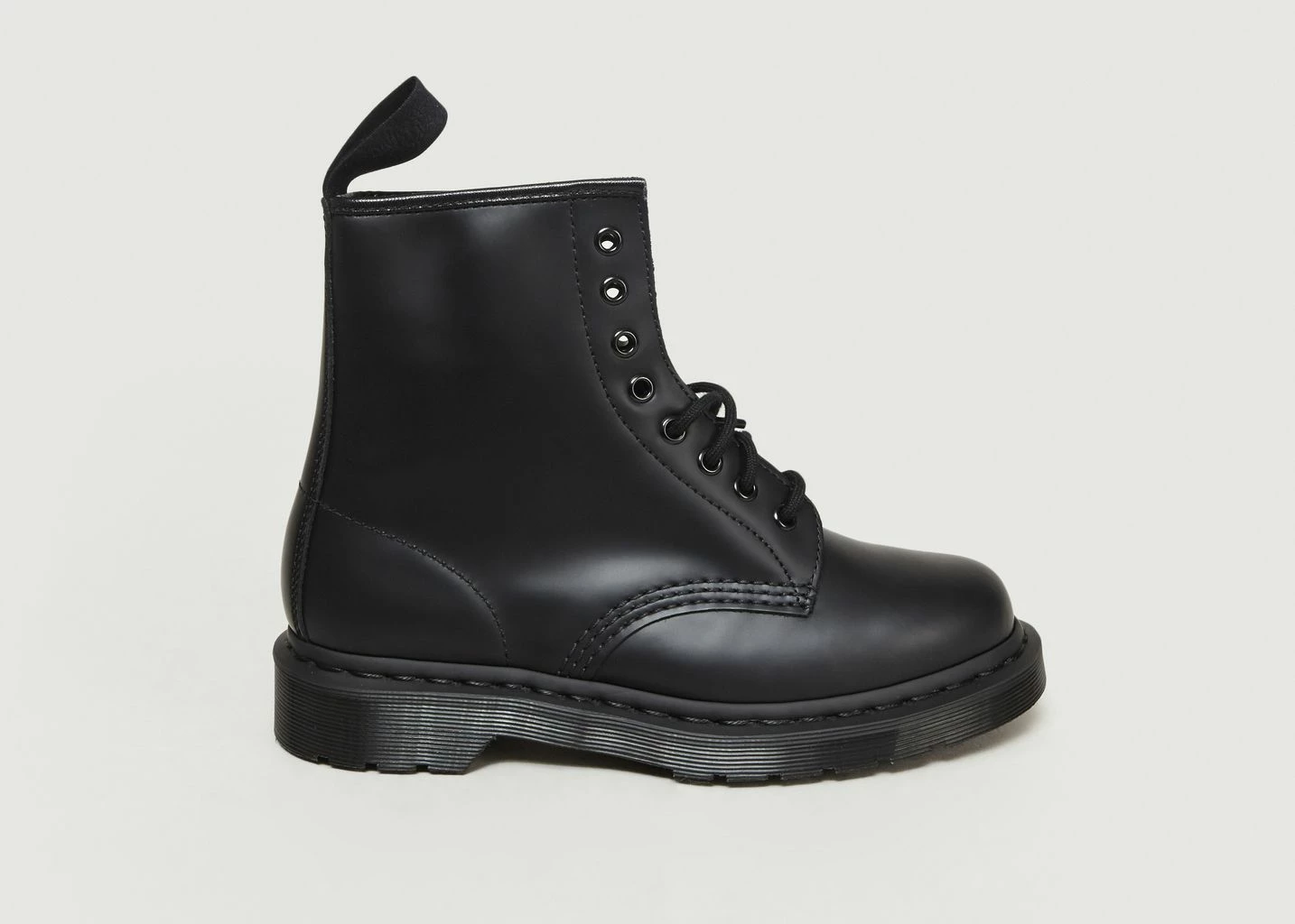 Black Smooth Dr. Martens leather boots with high shine finish, tonal lace up closure, leather lining, canvas footbed, 2cm heel height, 15 cm upper, ergonomic heel tab, tonal topstitching, rounded toe. The 1460 Mono Boot has a solid colour sole, welt, stitching, eyelets, laces, heel loops and even linings— for a monochromatic look from the ground up. Made with the durable Dr. Martens Smooth black leather, this unisex boot is constructed on an iconic air-cushioned AirWair™ air-cushioned Bouncing Soles for unparalleled comfort. It’s built to last using one of the finest methods of construction: the Goodyear Welt — which means the upper and sole are sewn together in our heat-sealed z-welt stitch. And true to form, the boot retains all the classic Doc’s DNA, including grooved sides, stitching and a heel-loop. In summation – a bold basic that speaks to the brand’s youth culture connection.
