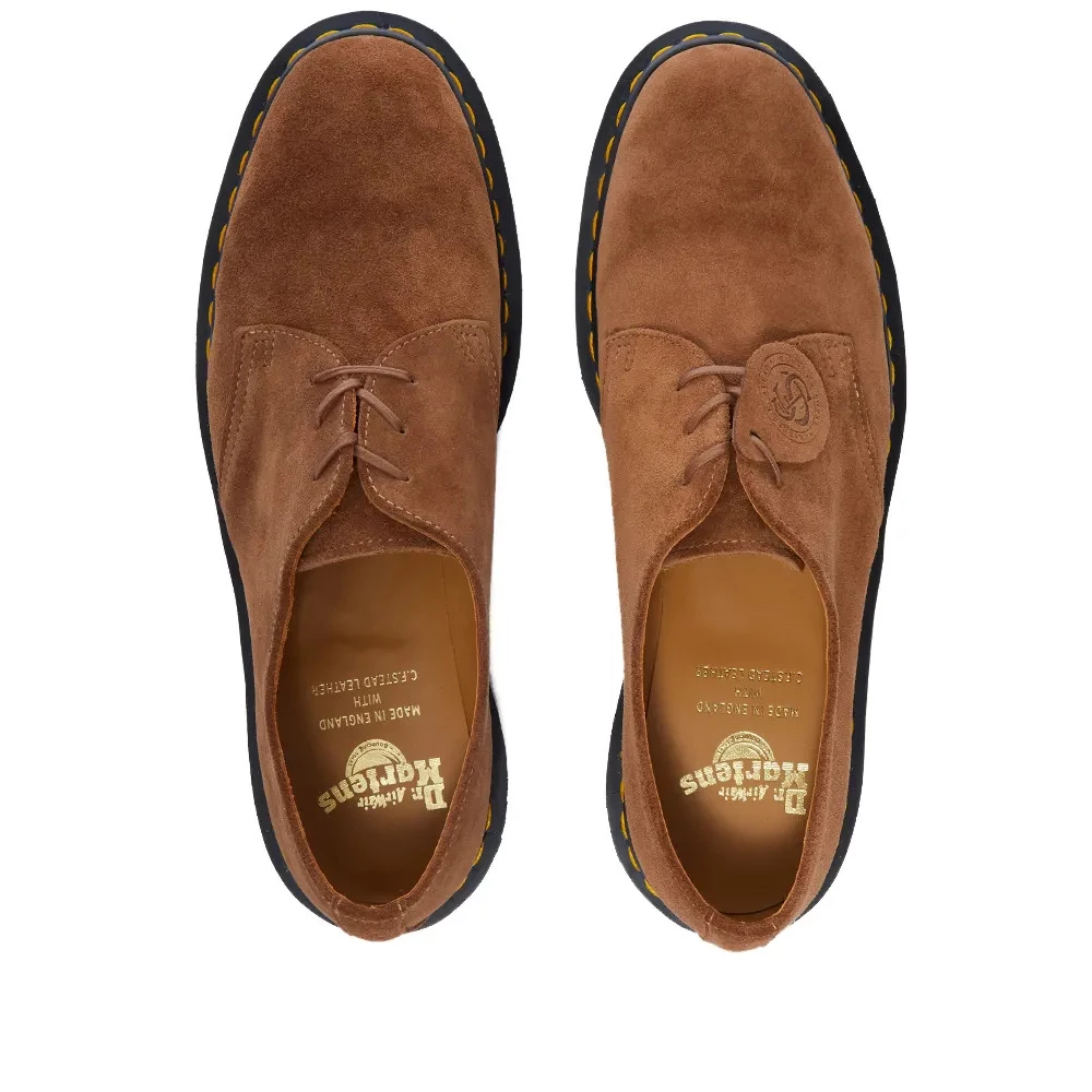 Descubierto en nuestro archivo, el Archie es una edición mejorada de nuestro zapato Original de 3 ojales, con una horma cónica 387 con una silueta elegante y refinada y una suela aerodinámica V18. la edición Archie II MIE en gamuza Repello balck Calf de calidad fina de C. F. Stead con cordones de algodón encerado a tono y pespuntes ribeteados en amarillo. Están terminados con una etiqueta de cuero y una plantilla de cuero con un logotipo dorado.