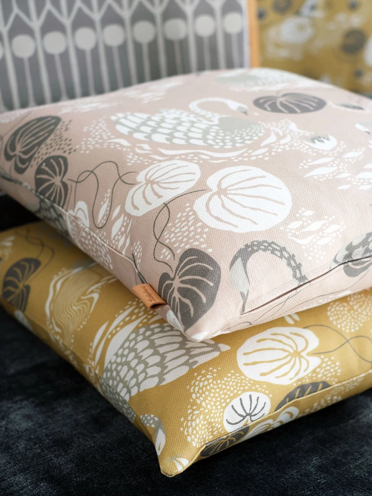 Our cushion covers comes in a wide range of patterns. The cover is made of our high quality fabric weave made of 45% linen and 55% cotton. We have developed the weave to make our patterns age with grace and to stand the test of time. It has the visual quality of linen but is much stronger and more durable. Our lovely inner pillow made out of 100% ethically guaranteed feather to your basket