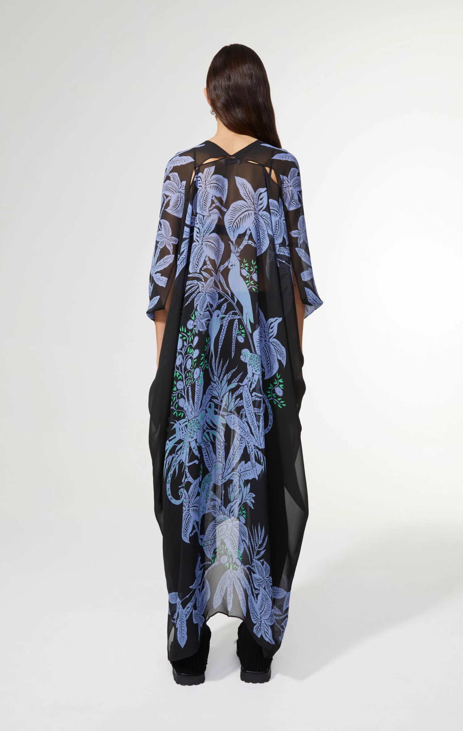 The caftan is made in a wonderful see-through silk that is both comfortable, airy and drapes beautiful on the body when worn. The caftan features the beautiful jungle print, that features a very organic plant print that has been printed on the front and back, while leaving the sides of the caftan in black. The print features a light blue and highlights in a bright green that just adds a bit of colour.