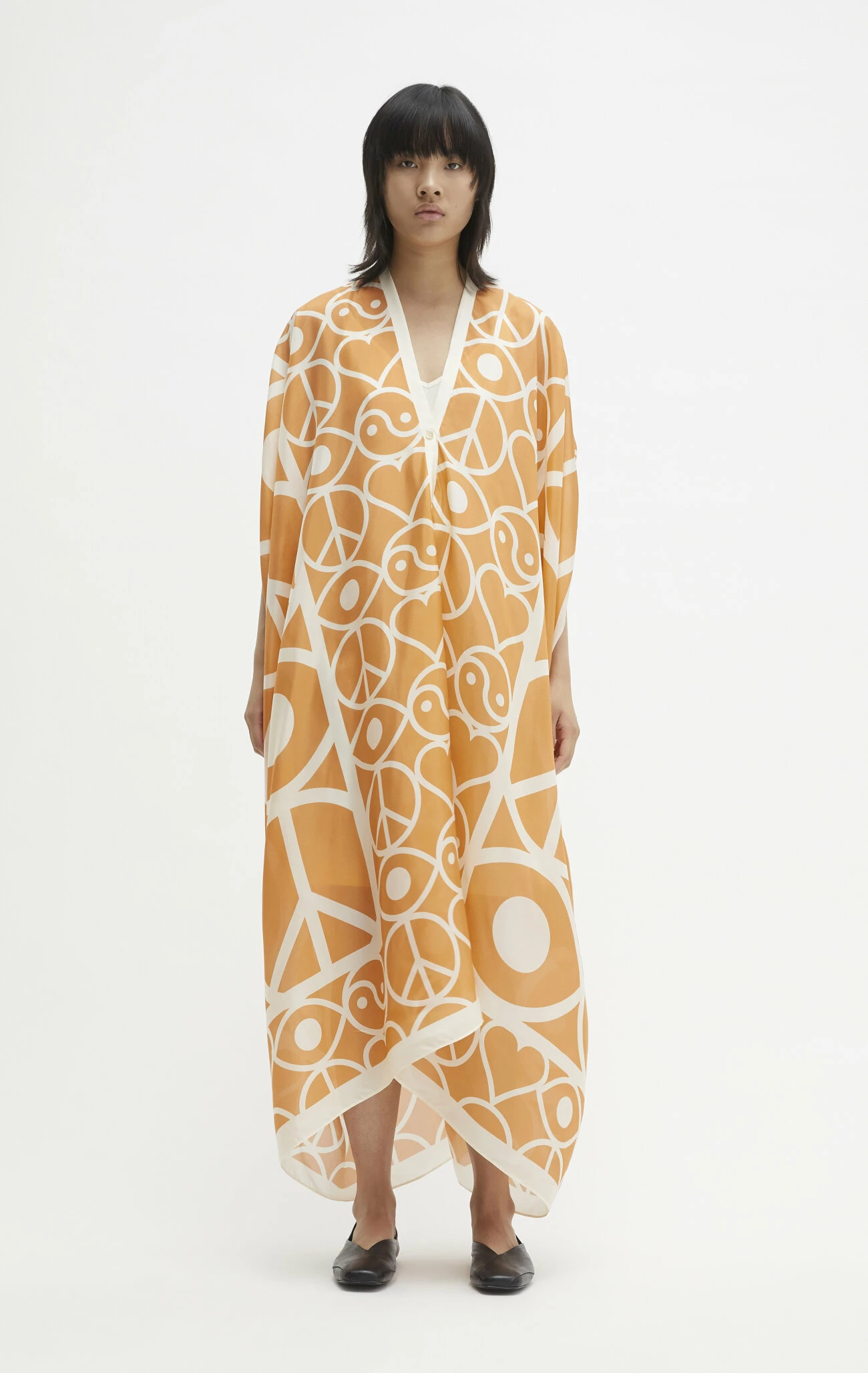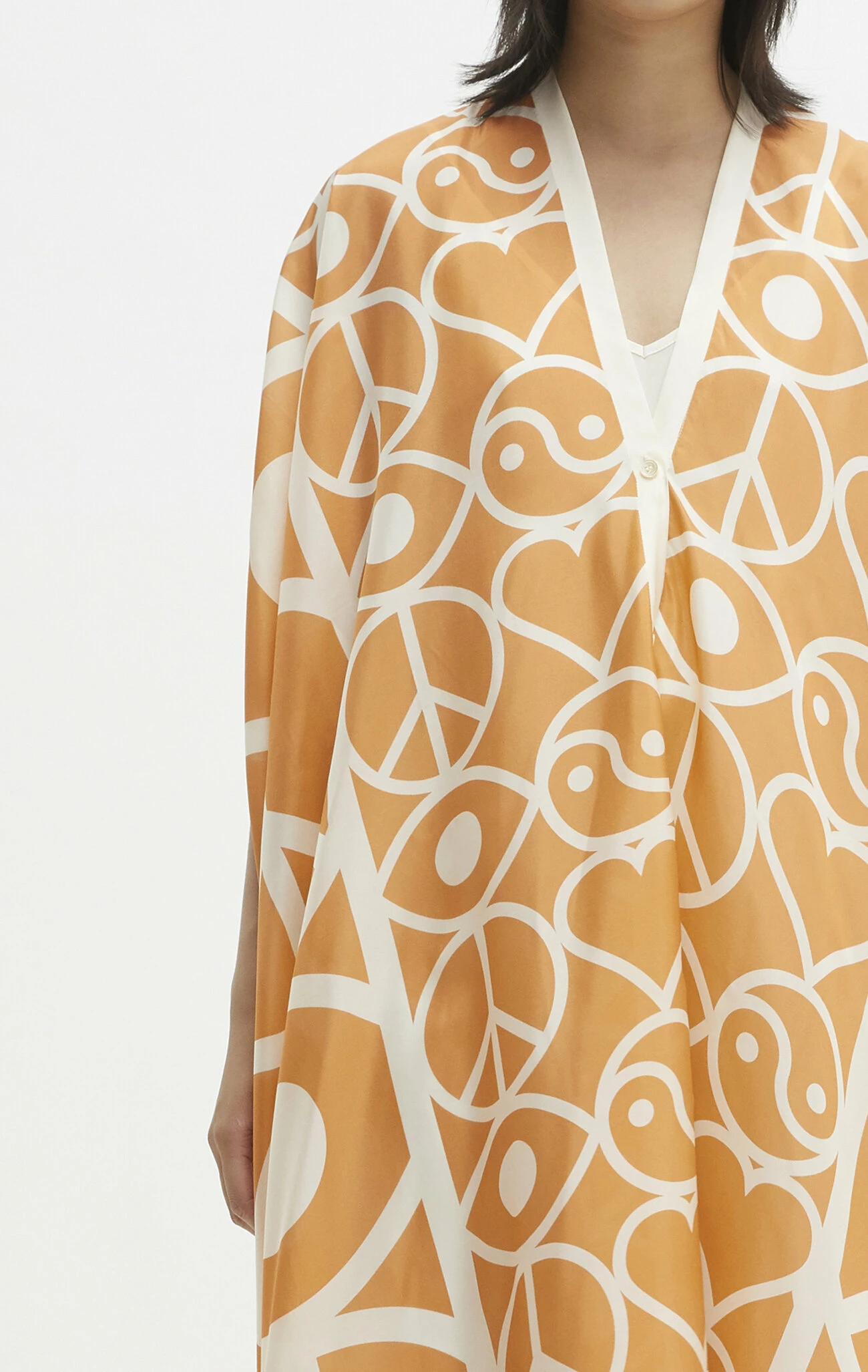 The caftan is made in a wonderful silk that is both comfortable, airy and drapes beautiful on the body when worn. The symbols print explores the spirituality and cultural iconography including the peace symbol; the third eye, the heart and a ying and yang interpretation reminiscent of breasts.