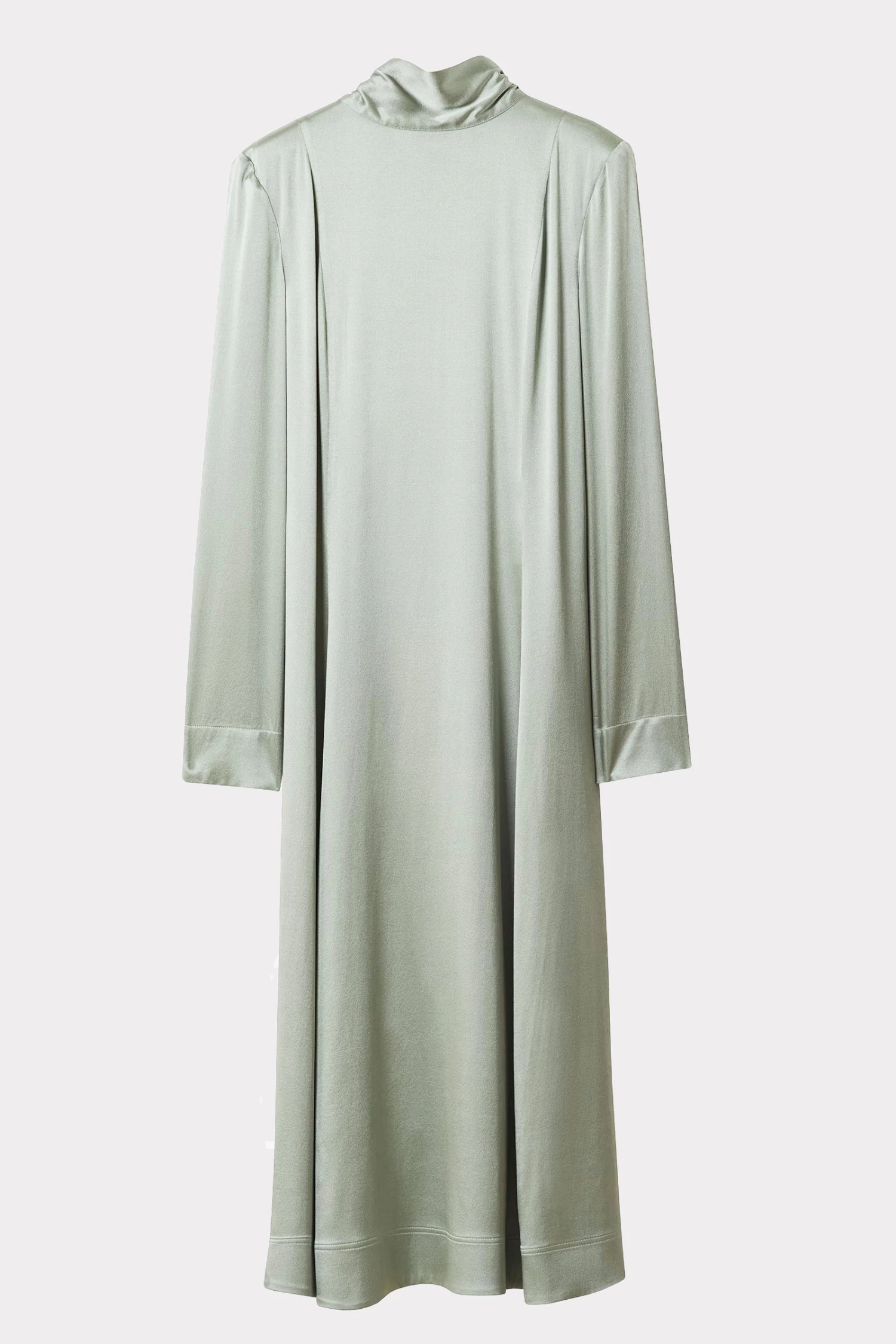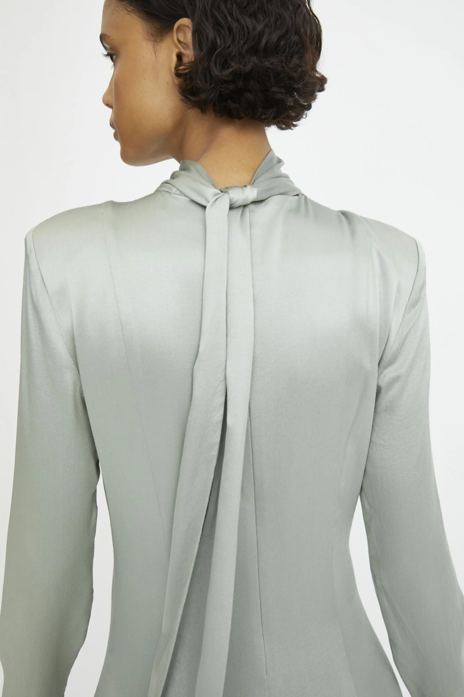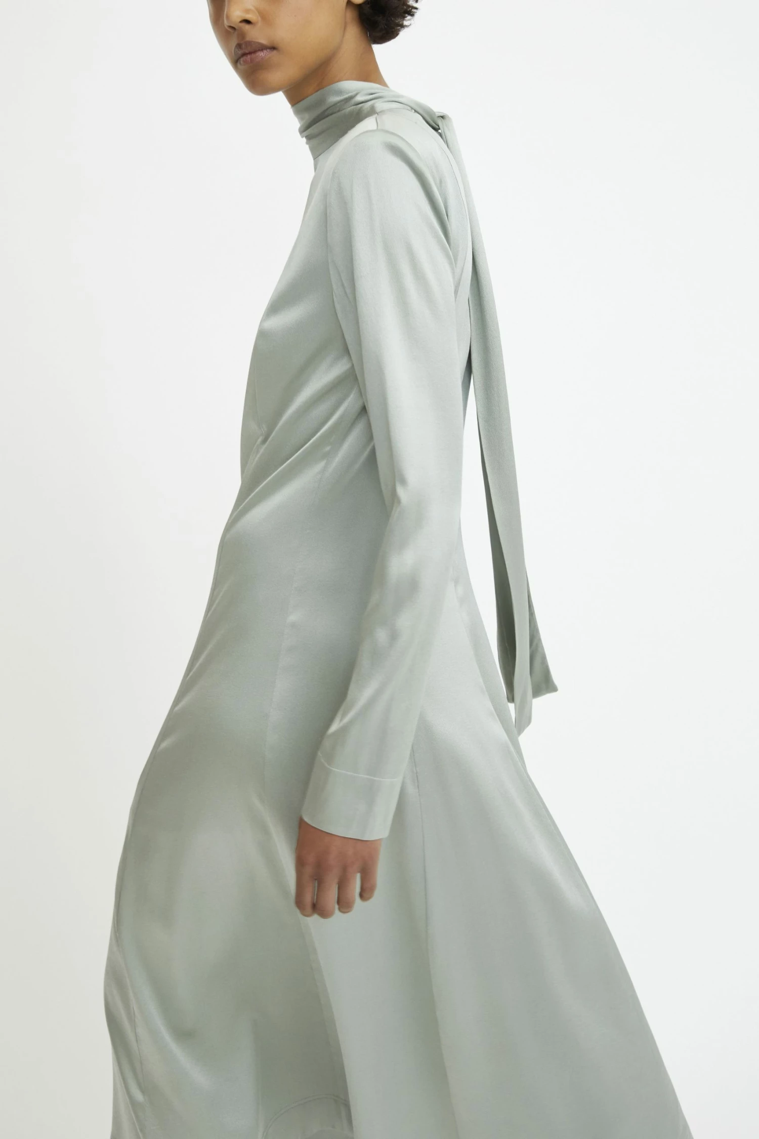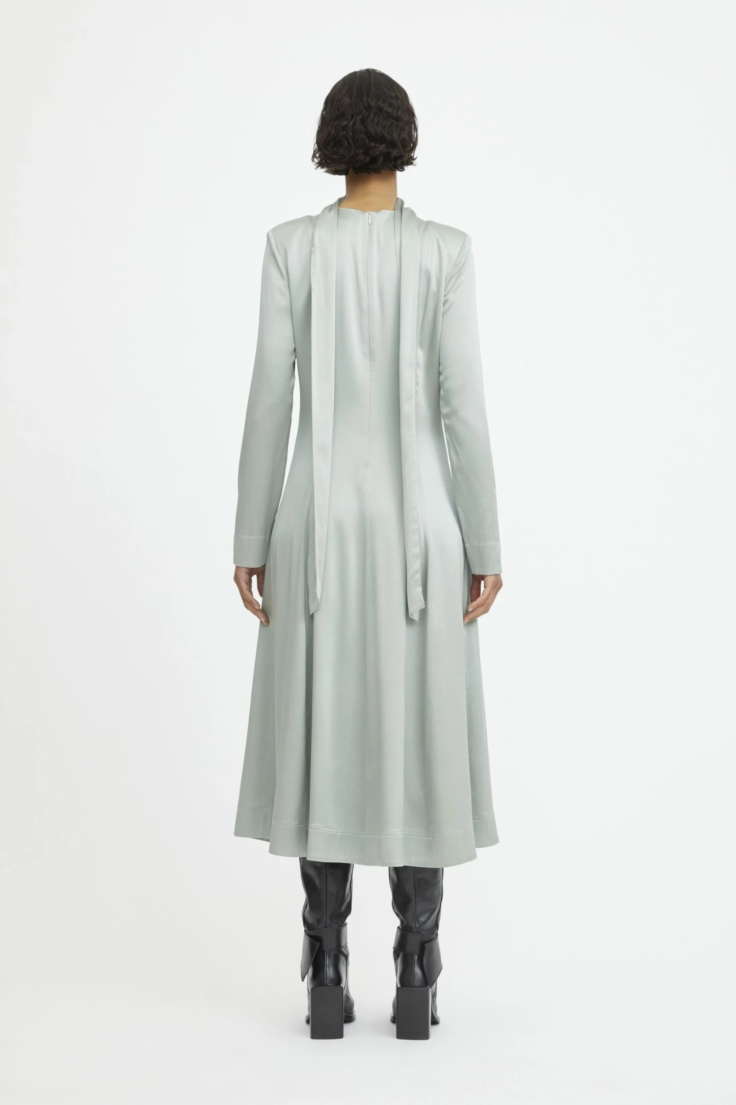 The dress has a high neckline at the front goes into a long scarf at the back. The scarf detail can be used to style the dress in many different ways depending on the desired look. The dress has small shoulder pad that elevates the shoulder slightly creating a sharp look. The sleeves are long and made in a semi loose fit. The dress is made in a semi fitted silhouette on the body with extra width from the hips and down. The dress below mid-calf length.