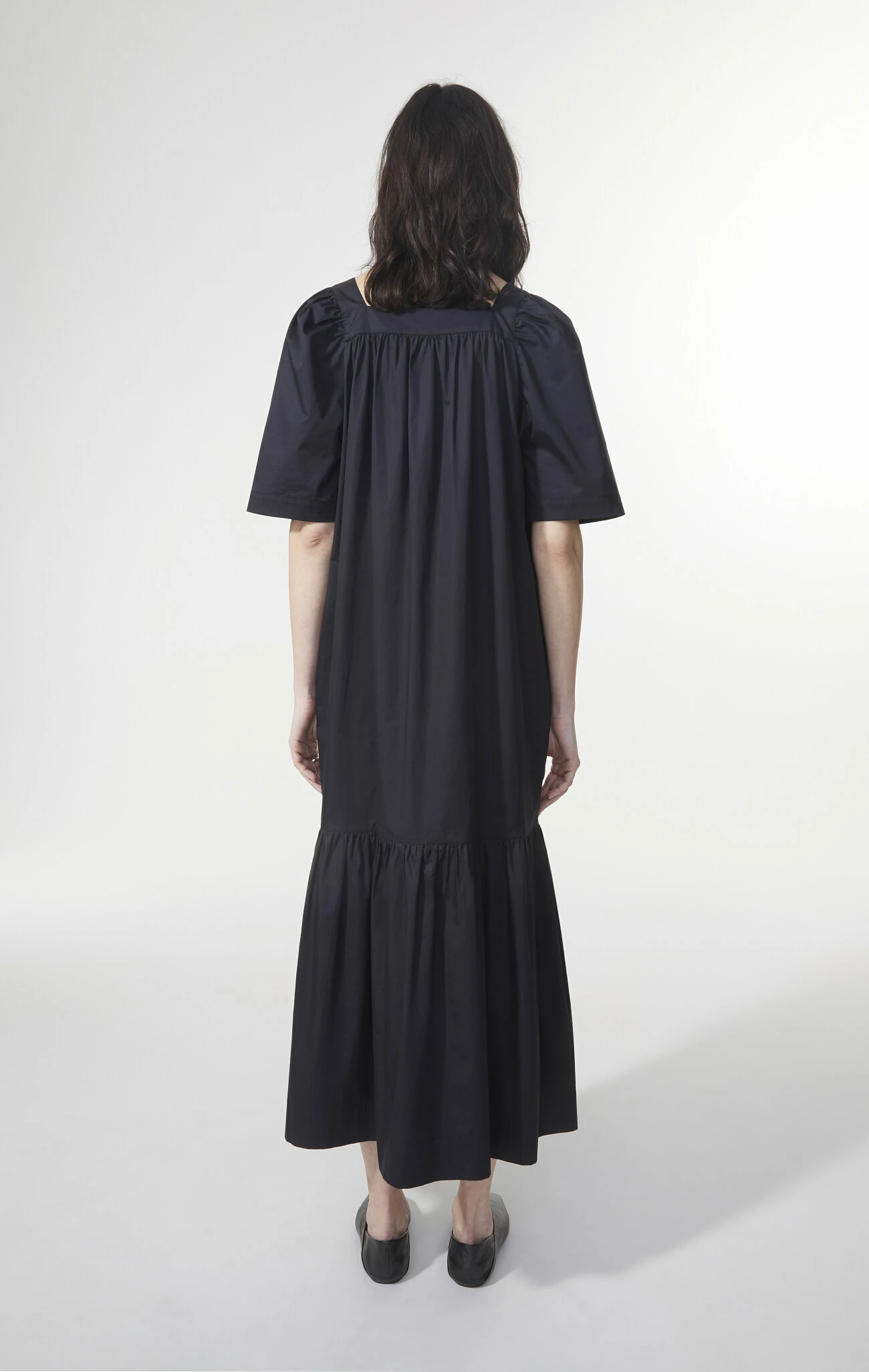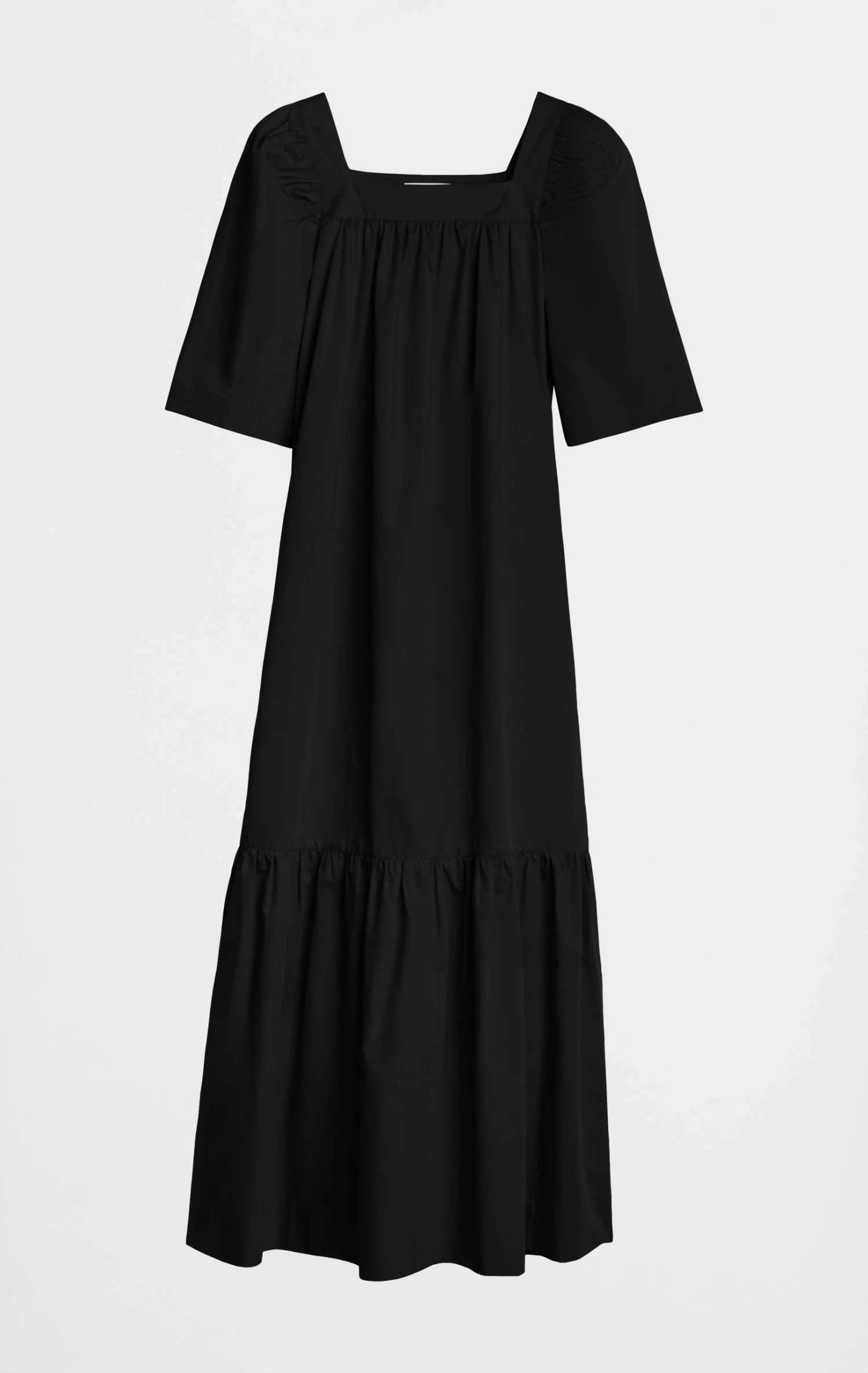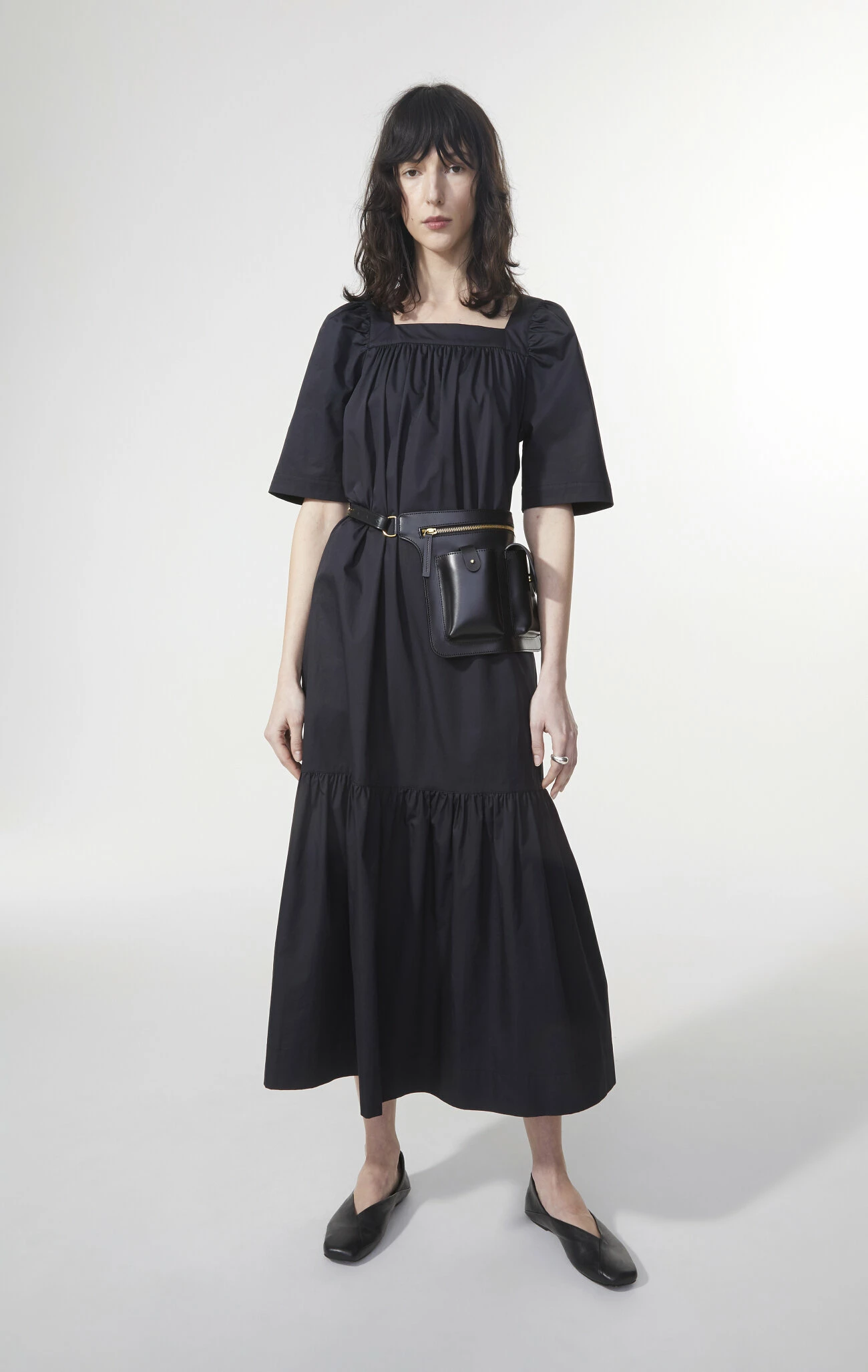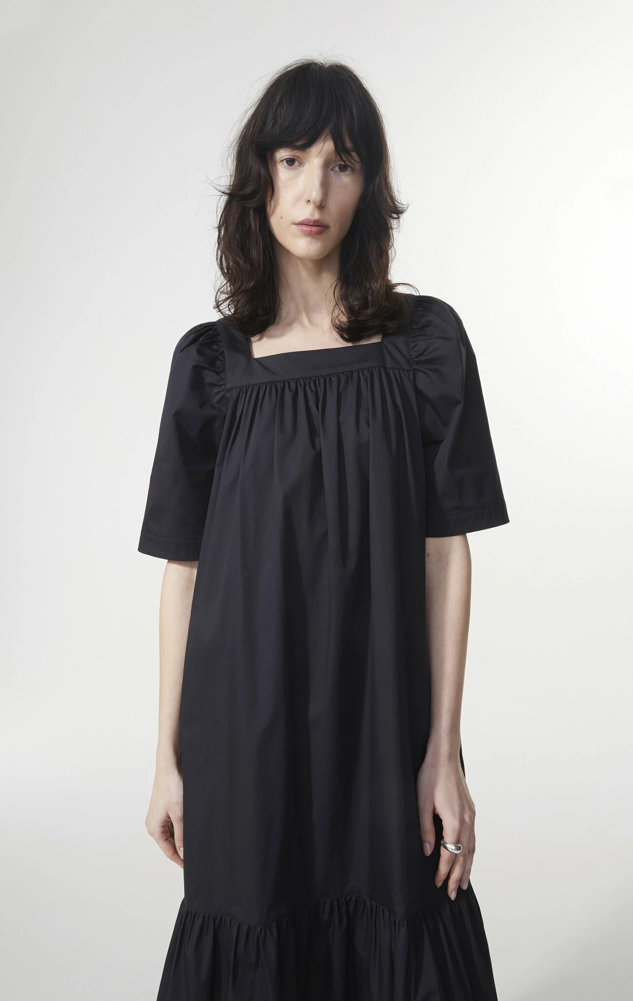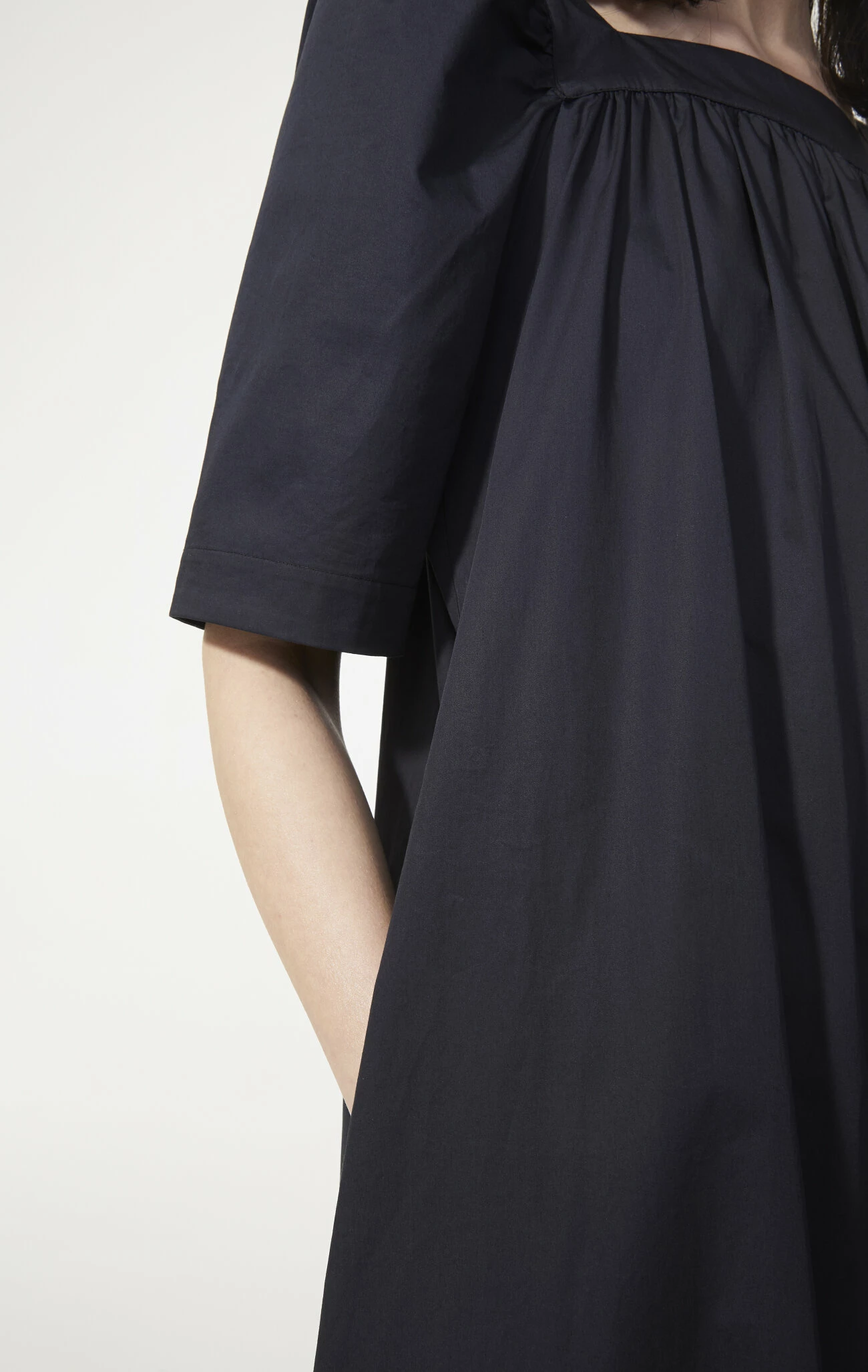 The dress has a beautiful square neckline with shirring at the neck and shoulders. The dress has a elbow length wide puff sleeve and pockets at the side. It’s cut in a slightly a-line shape with a big flounce at the bottom which adds a feminine touch to the dress. The dress is made in a crisp organic cotton that gives the dress a voluminous yet flattering look. The dress has a slightly cropped length.