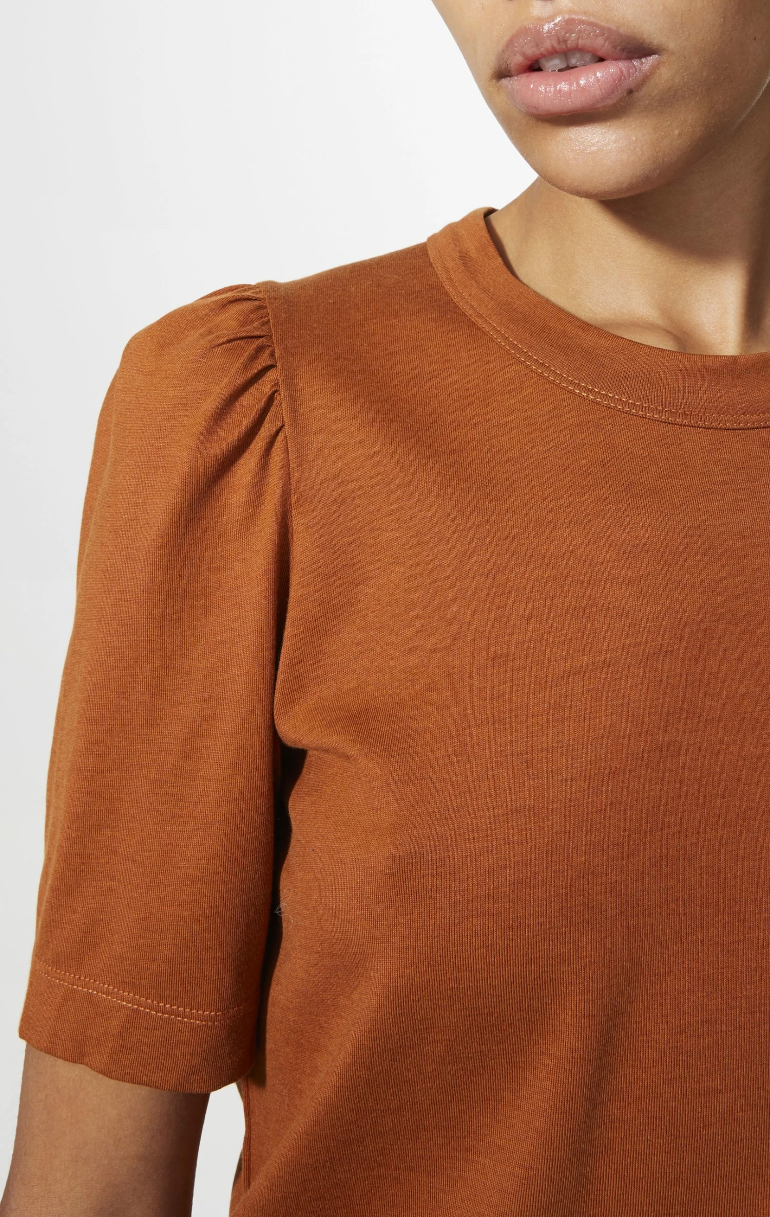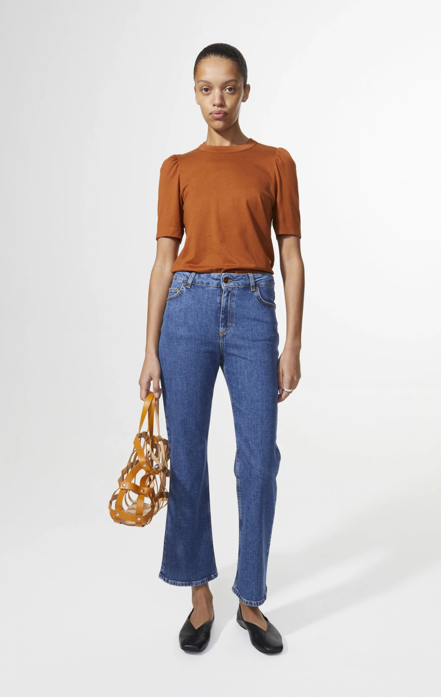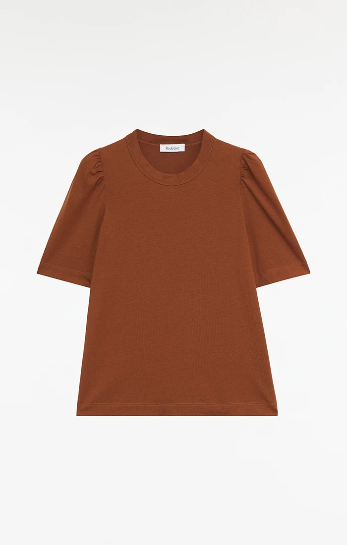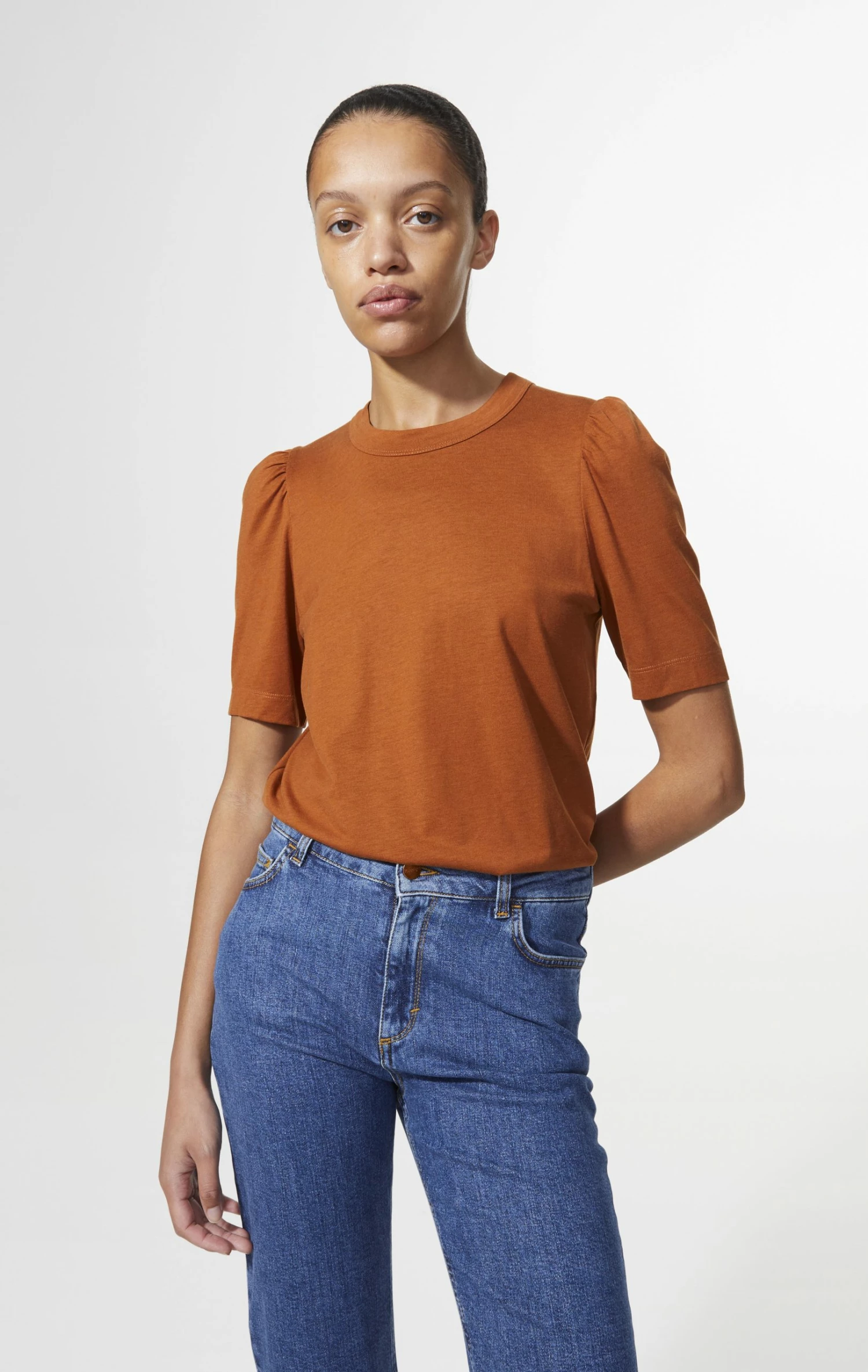 The t-shirt has a round neckline, a short puff sleeve and is made in a straight cut on the body. The shirt is just long enough so that you can easily tuck it in or you can wear it loose without it becoming too long.