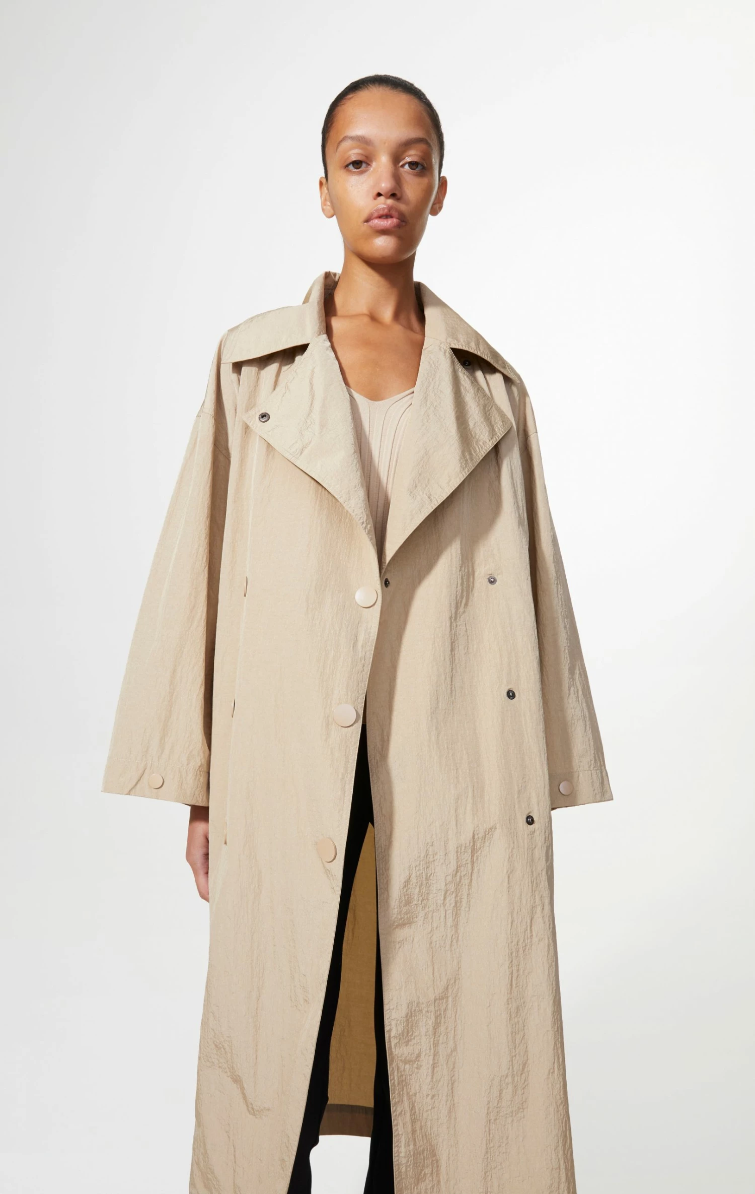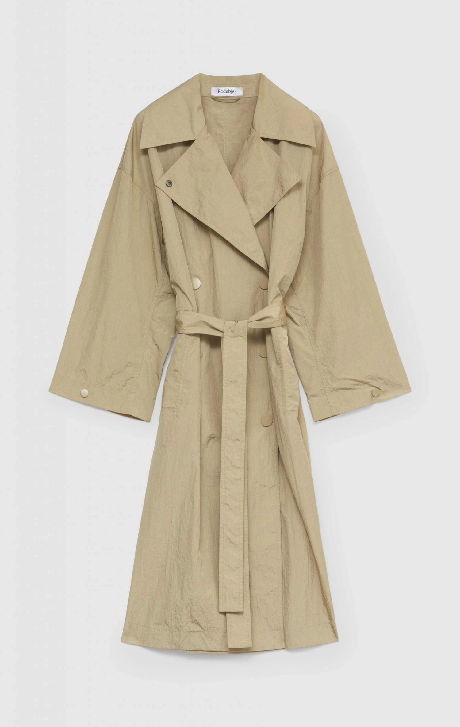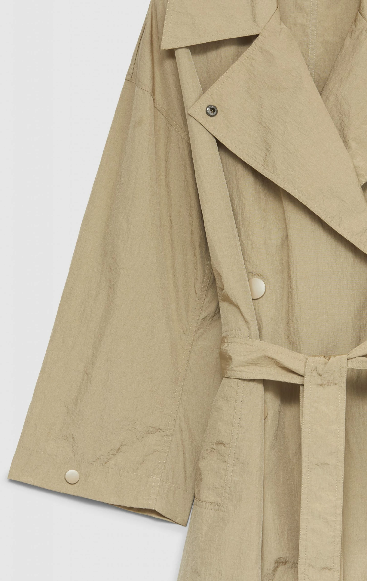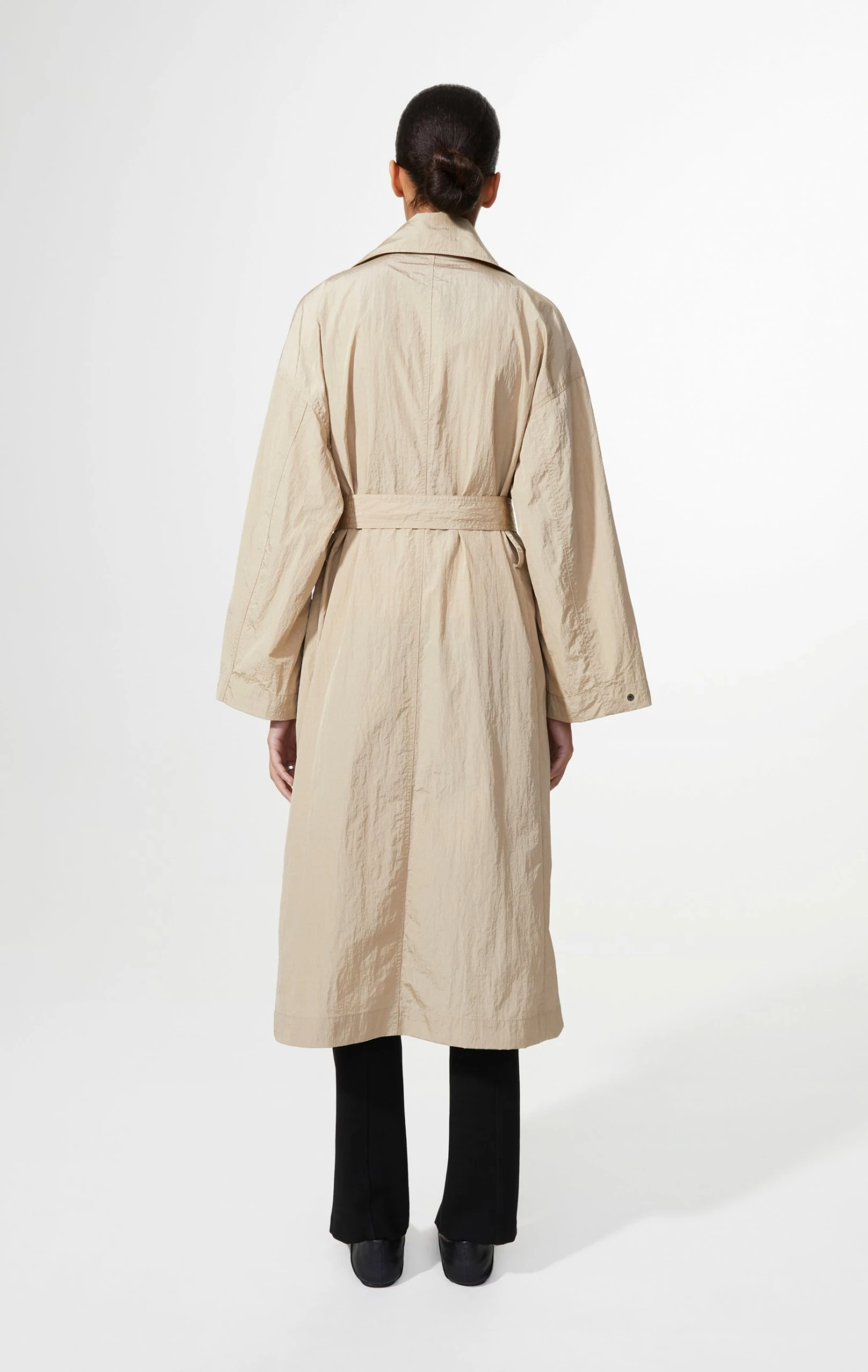 The coat has an oversized collar and has been made in a relaxed fit. It has dropped shoulders and long sleeves. The sleeves are made in a wide fit and has a button closure on the sleeve, that can give the sleeve a more fitted shape. The coat is double breasted and has been made in a loose fit on the body. It comes with a belt that can be used to enhance the waistline, but it can also just be worn loose and still has a beautiful silhouette. The recycled nylon that has been used for the coat has been given an eco-friendly water repellent treatment. Do keep in mind that the coat is water resistant and not water proof.
