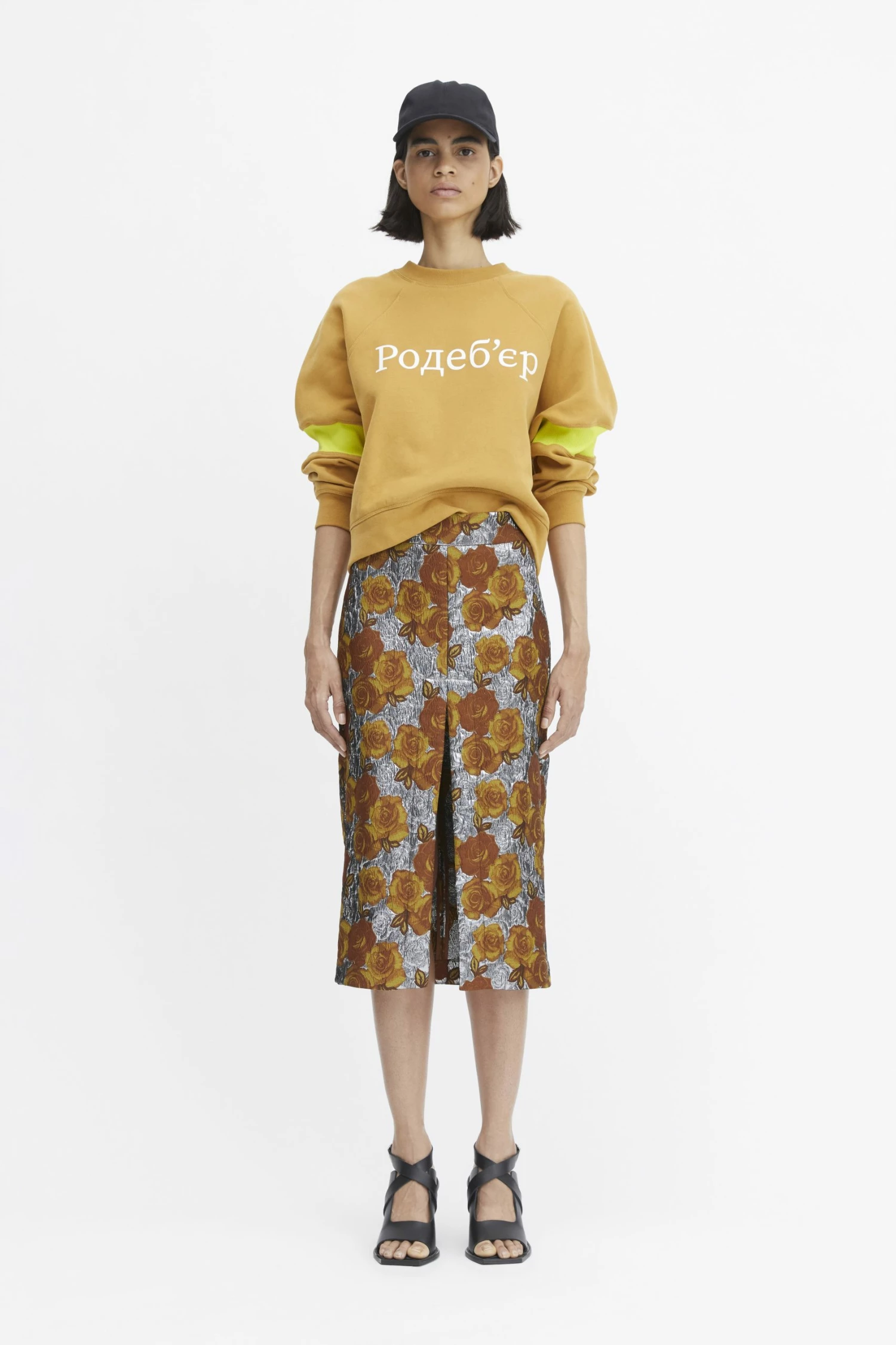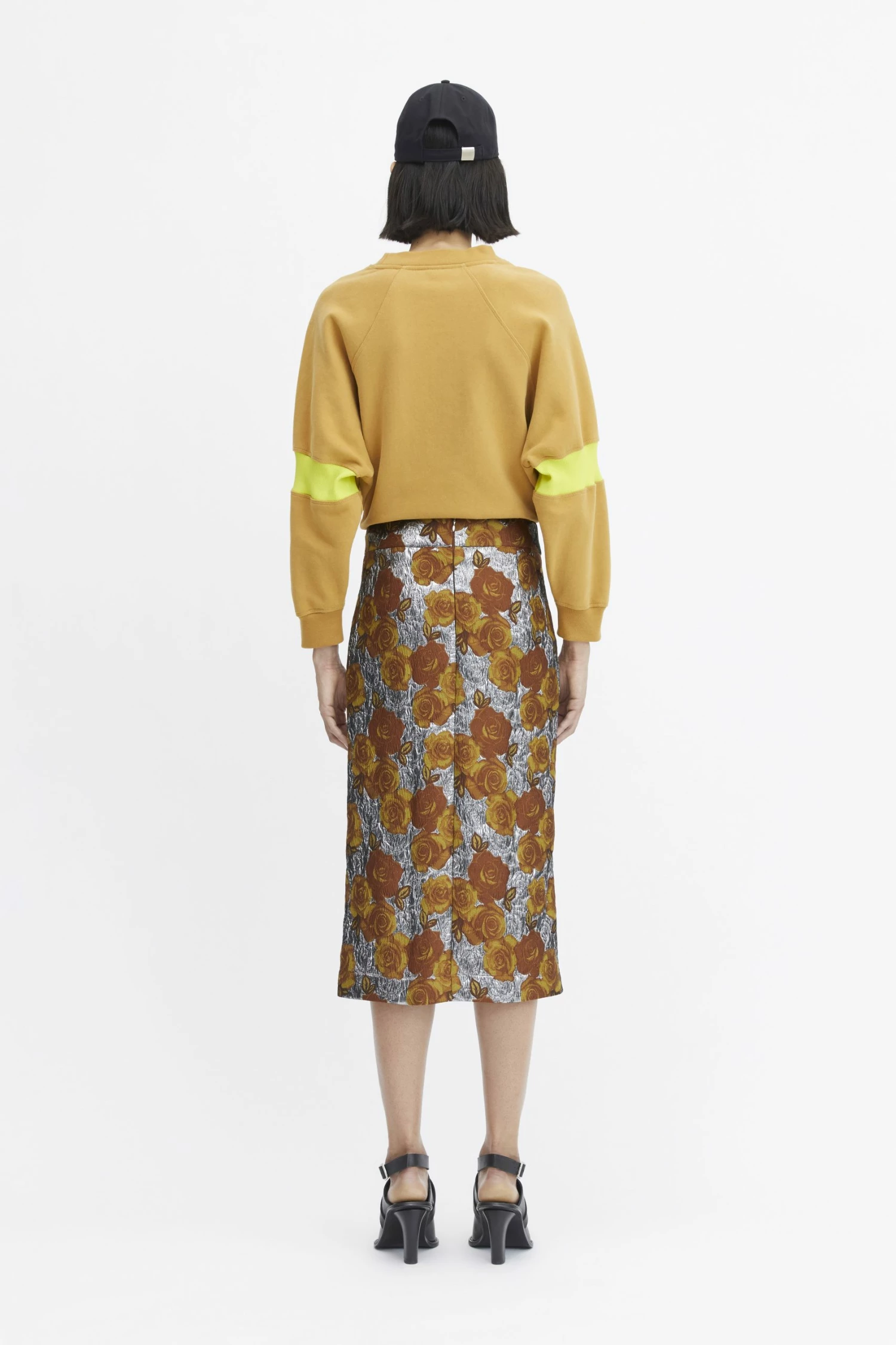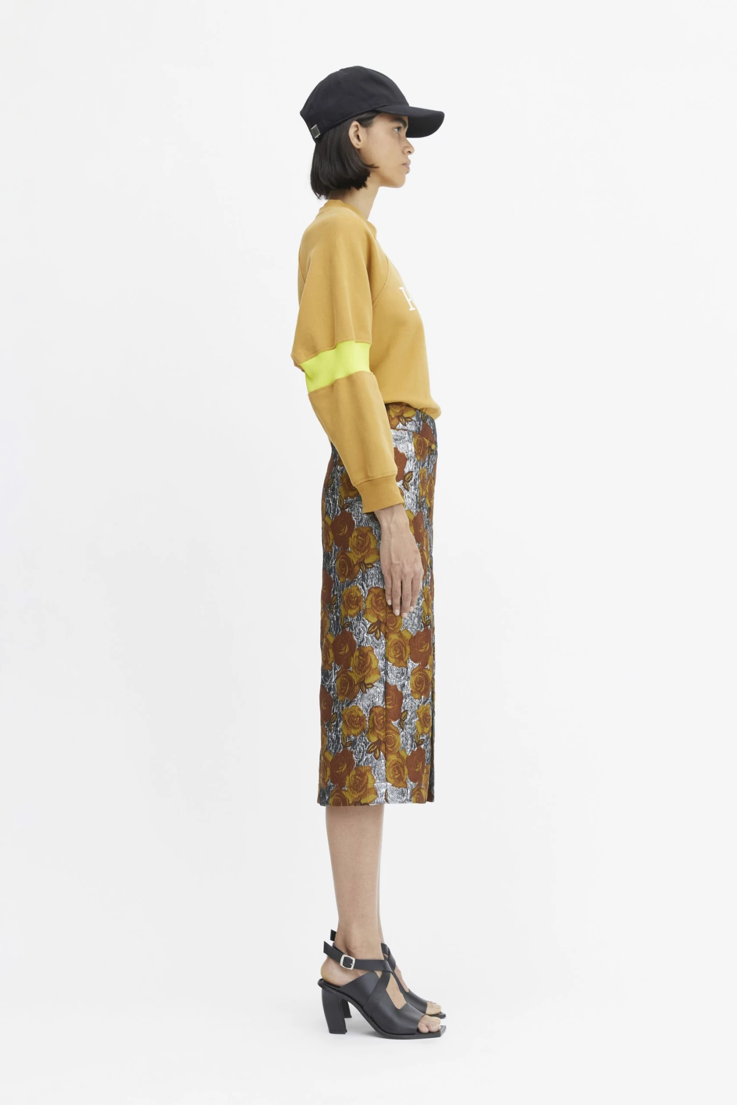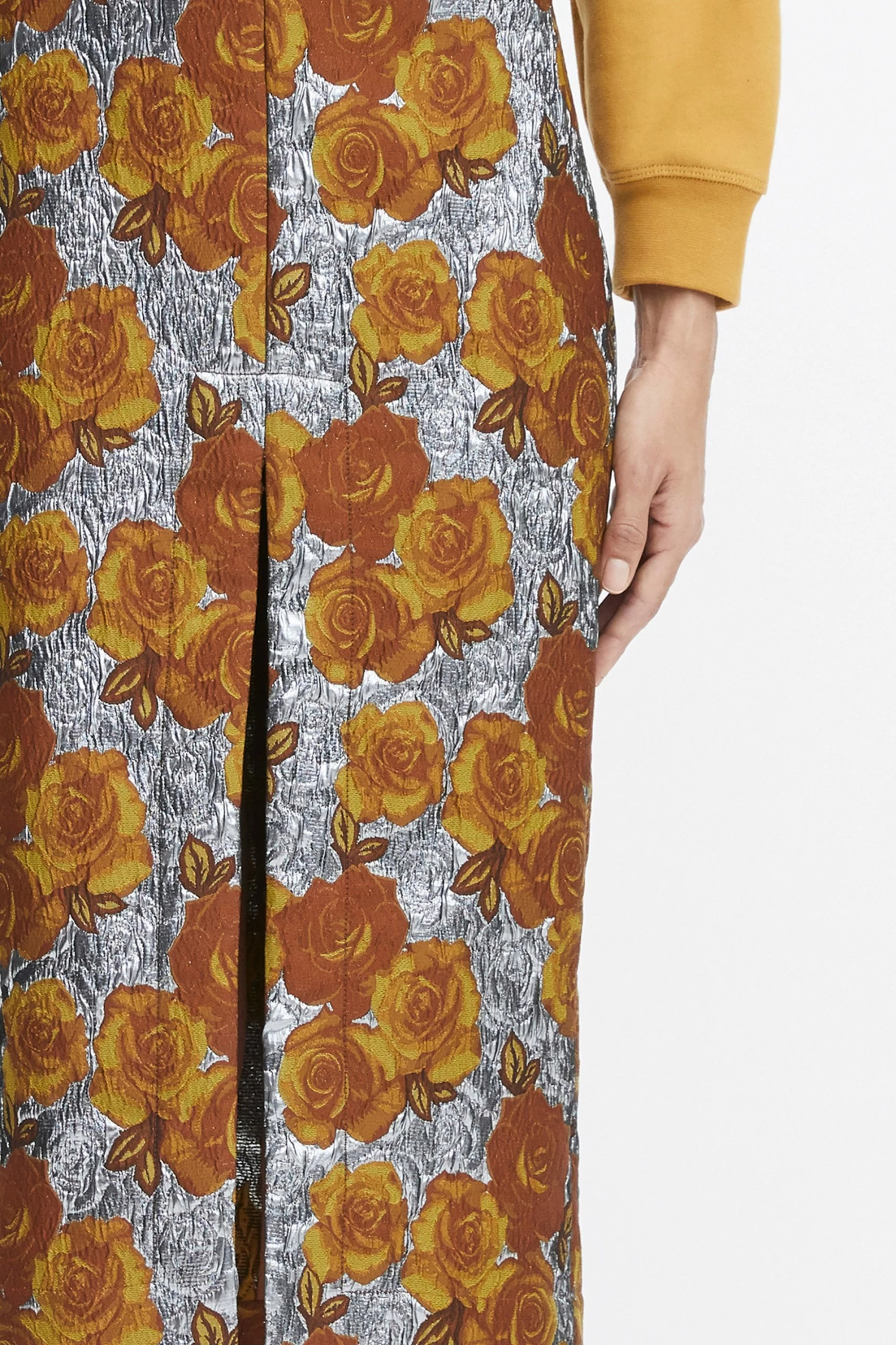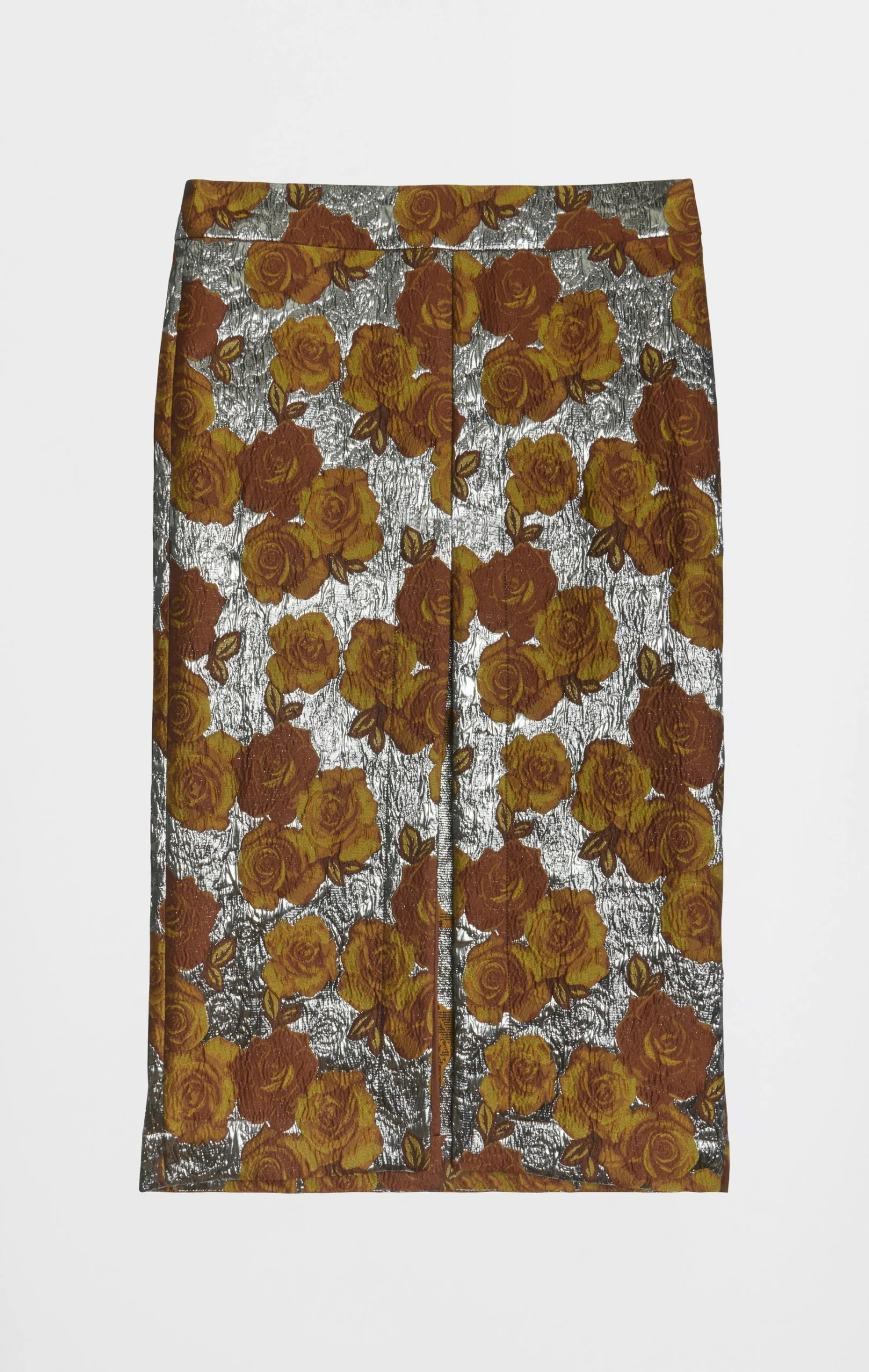 The skirt has a regular waist and is made in a straight cut. The skirt is fitted across the hip area and straight from the hips and down. It has a flattering below mid calf length. There is a sensual slit at the front which allows for ease of movement, but also adds a little lightness to the skirt. The skirt features a beautiful mix of havana brown roses on silver coloured backdrop, which creates a beautiful contrast between the two.