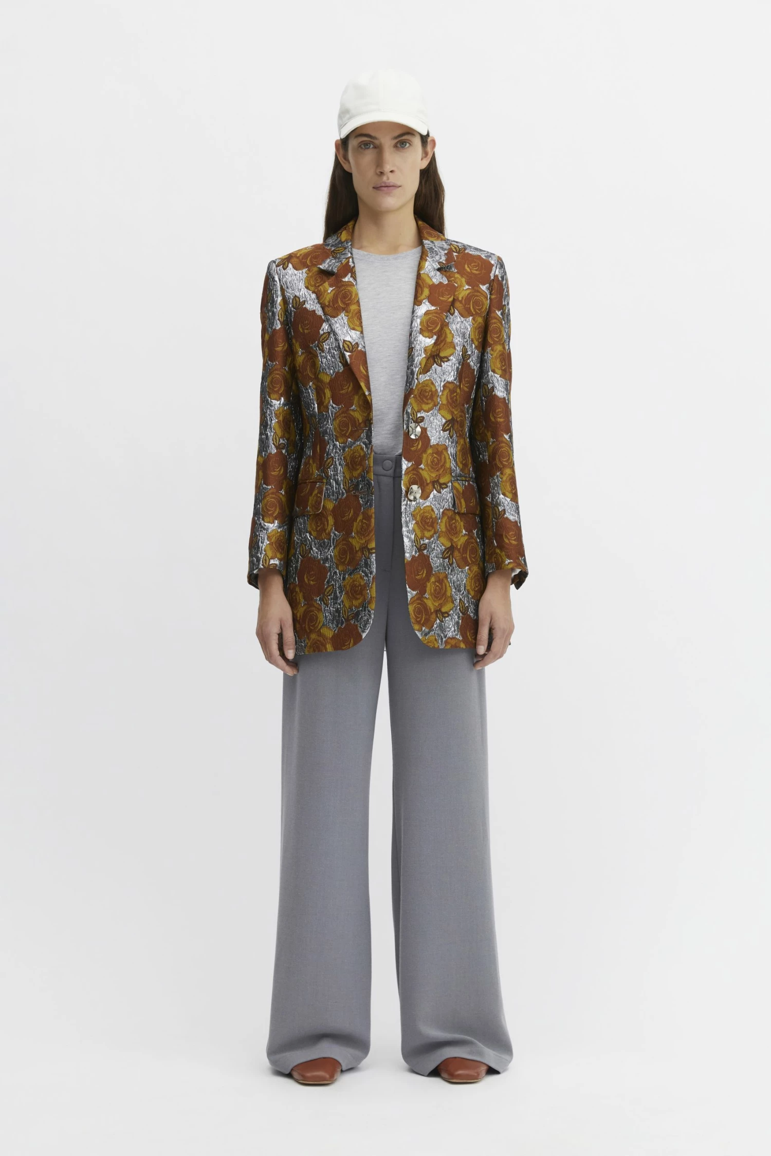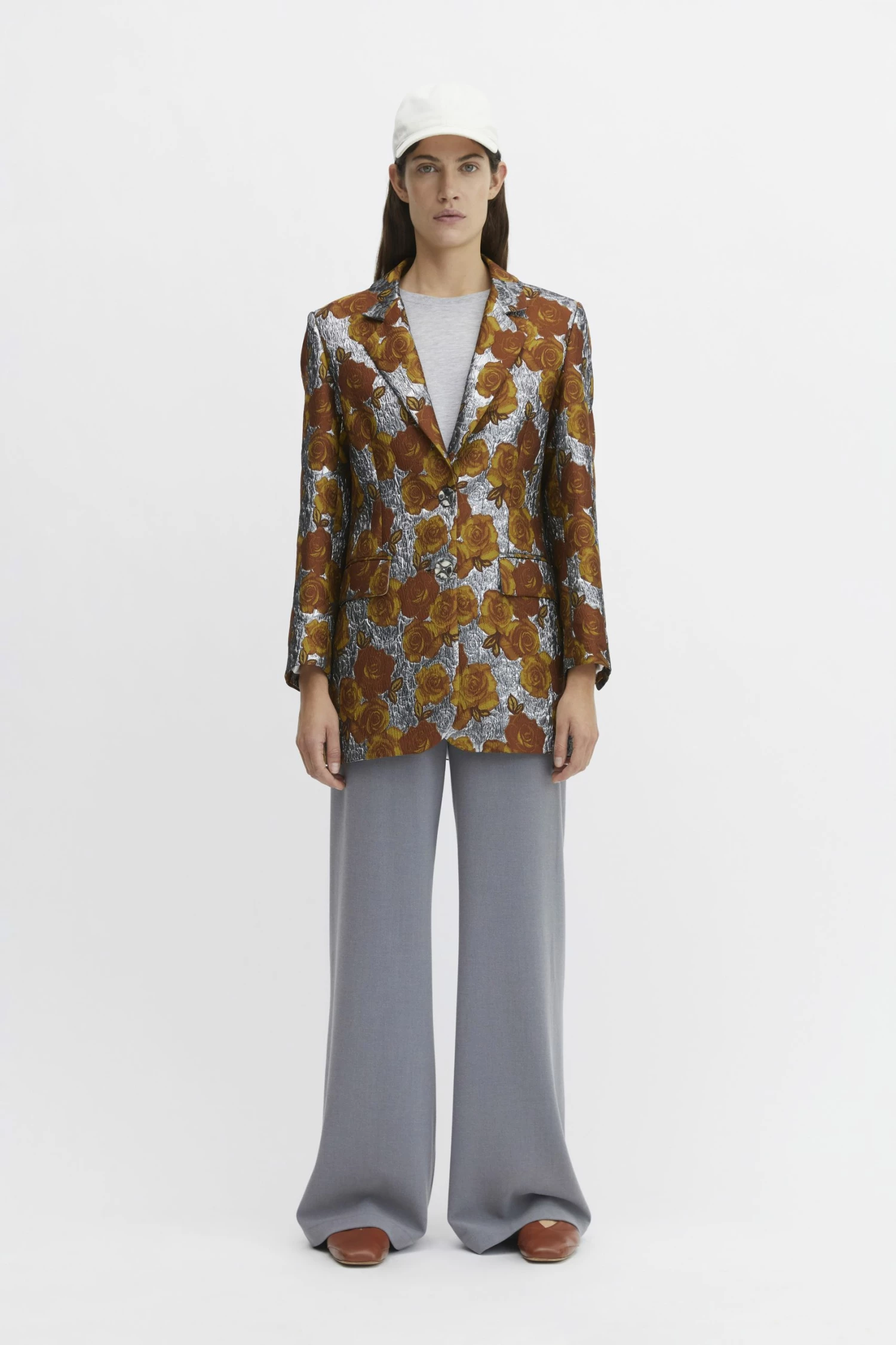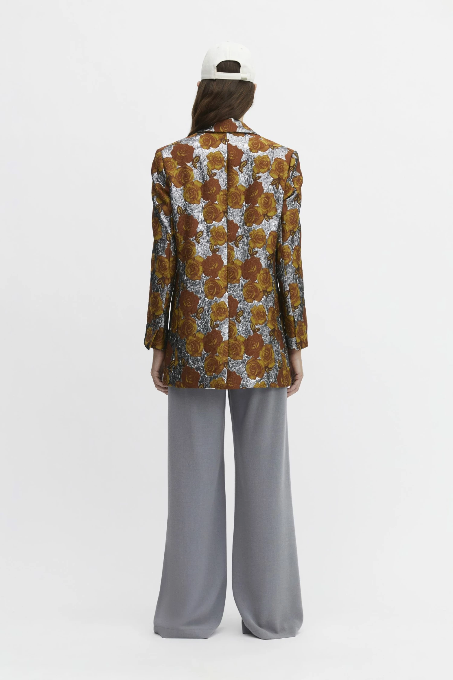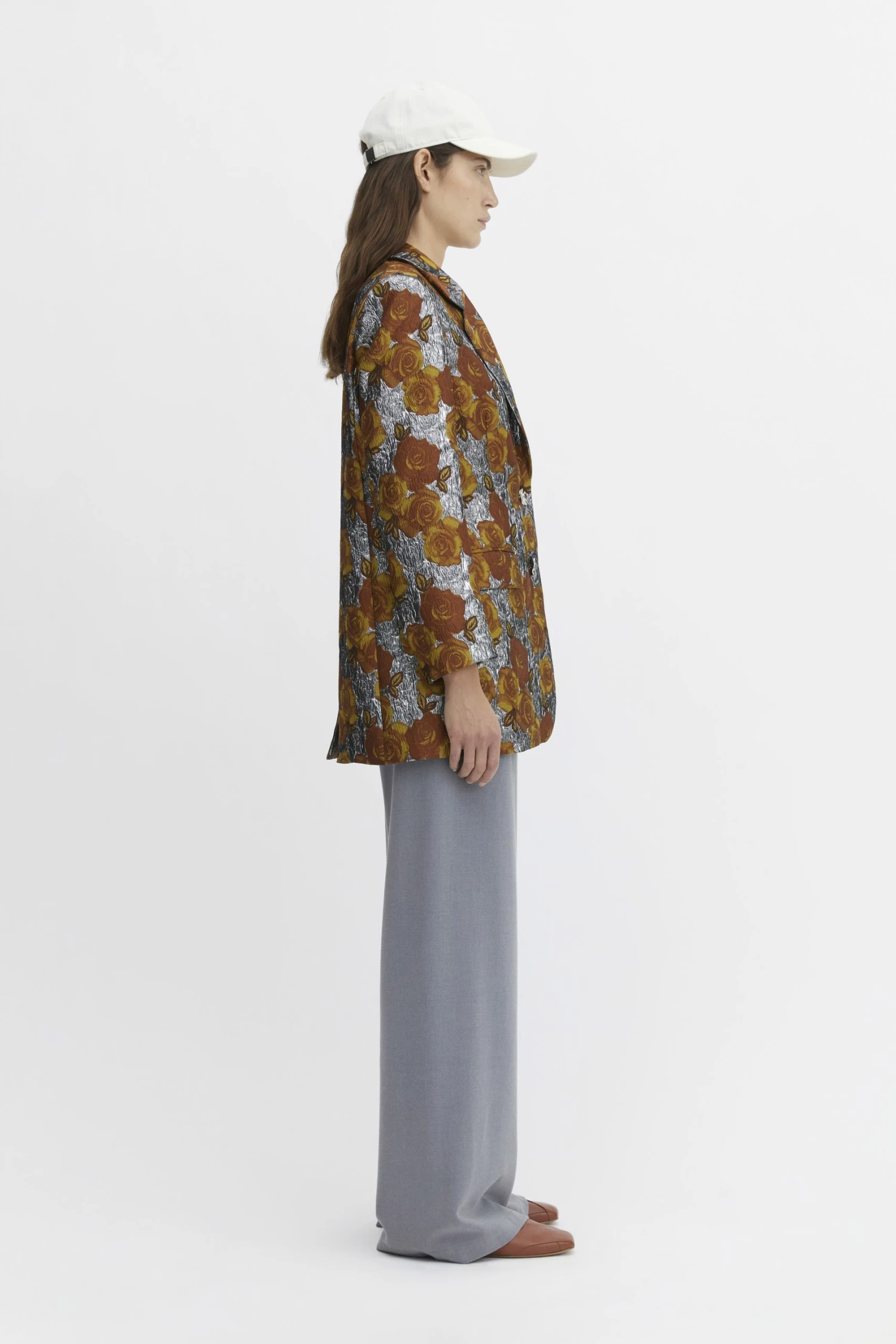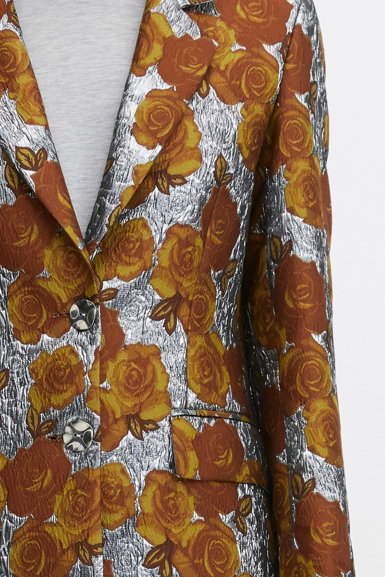 The jacket is made in a oversized fit, with big silver buttons and flap pockets at the front. The jacket is cut from a beautiful silver metallic fabric with big havana brown roses. The silver metallics together with the havana brown roses creates an interesting colour palette and contrast. The fabric has been crafted at a French fabric artisan mill. The jacket has a wide shoulder, regular sleeves, and below the seat length. The jacket has been shaped at the waist in order to create a feminine silhouette without being fitted at the waist.