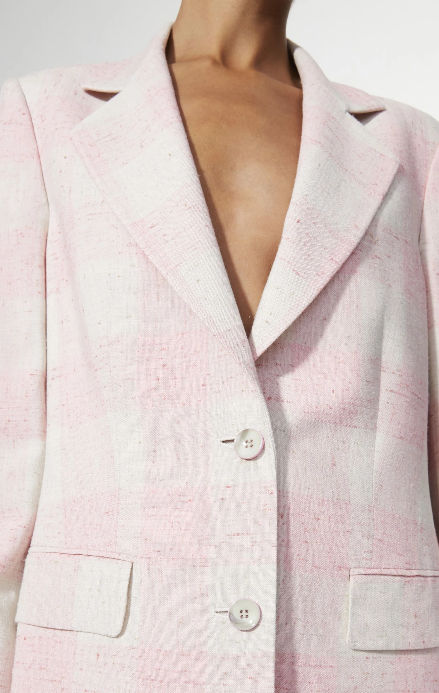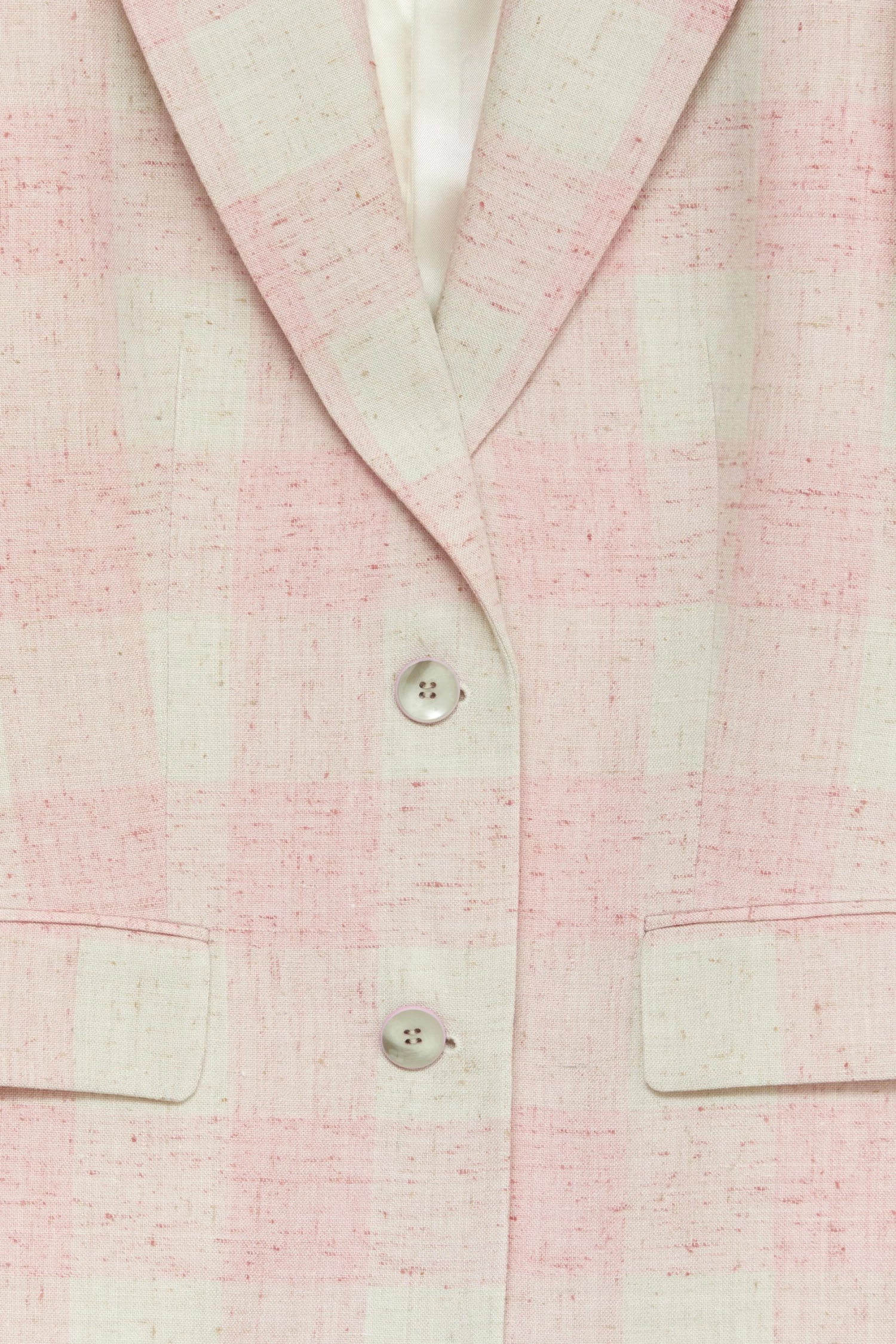 The blazer has a regular shoulder with a small shoulder pad and a long sleeve. The blazer has a two button closure, with beautiful coloured buttons. There two flap pockets at the front, the pockets has been closed but can easily be opened. The blazer has been shaped even though it is made in an oversized fit and it has a below the hip length. At the back there is a high slit.
