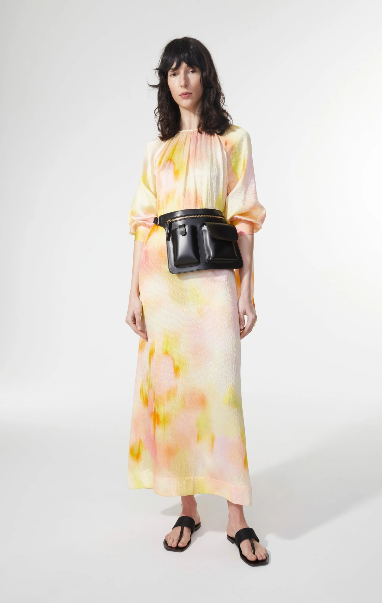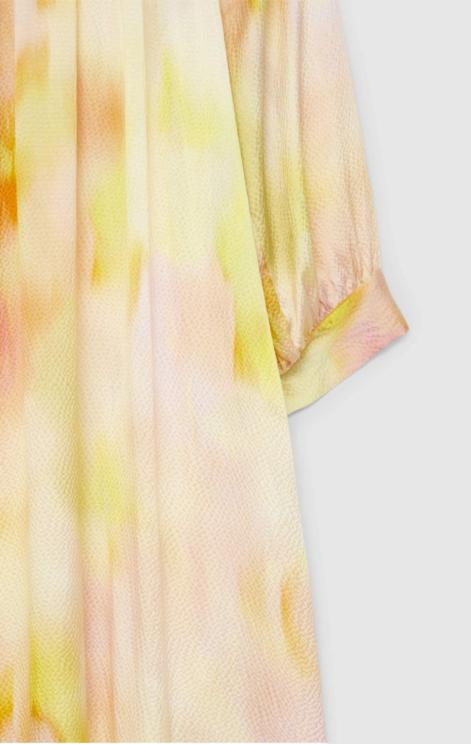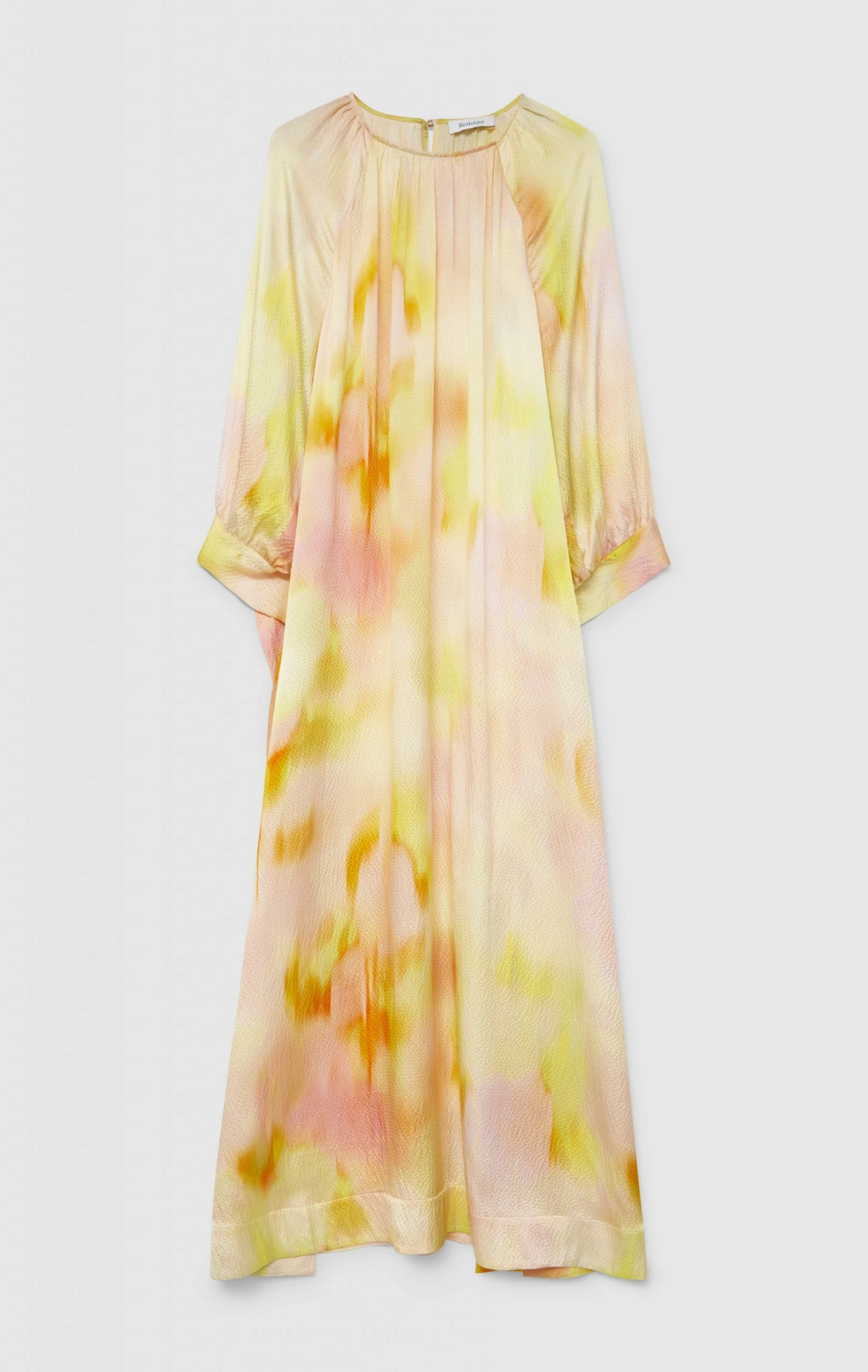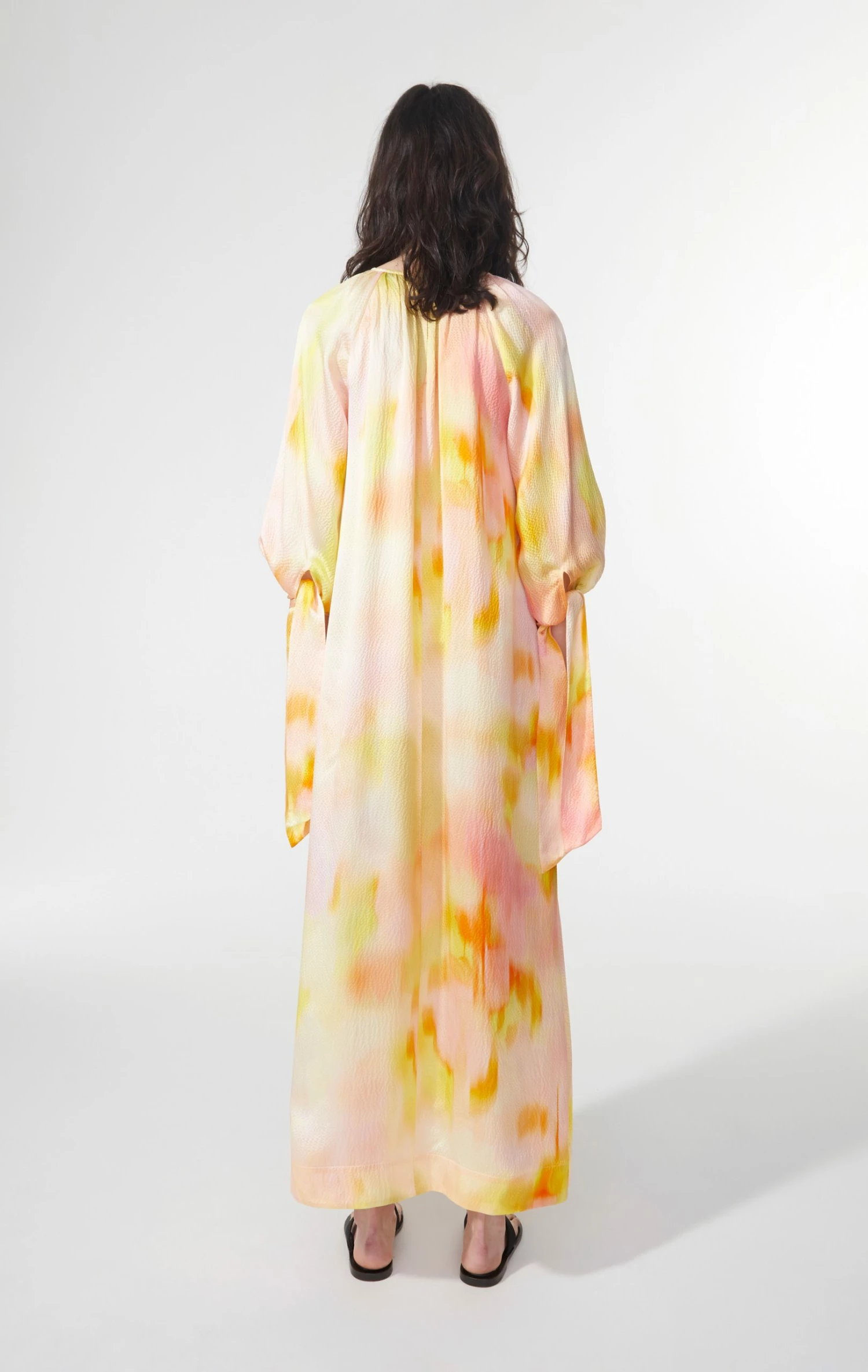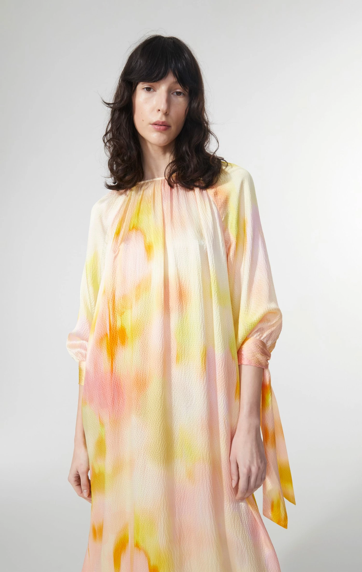 The dress has a round neckline, with button and keyhole at the back. The dress has a loose raglan sleeve that has a cuff with a tie detail. The dress is made in a loose oversized fit and due to the lightness of the fabric the dress will get a beautiful flowy look. There are a slit at either side of the dress that allows for extra movement and further adds to the flowy look of the dress. The dress has an ankle length.