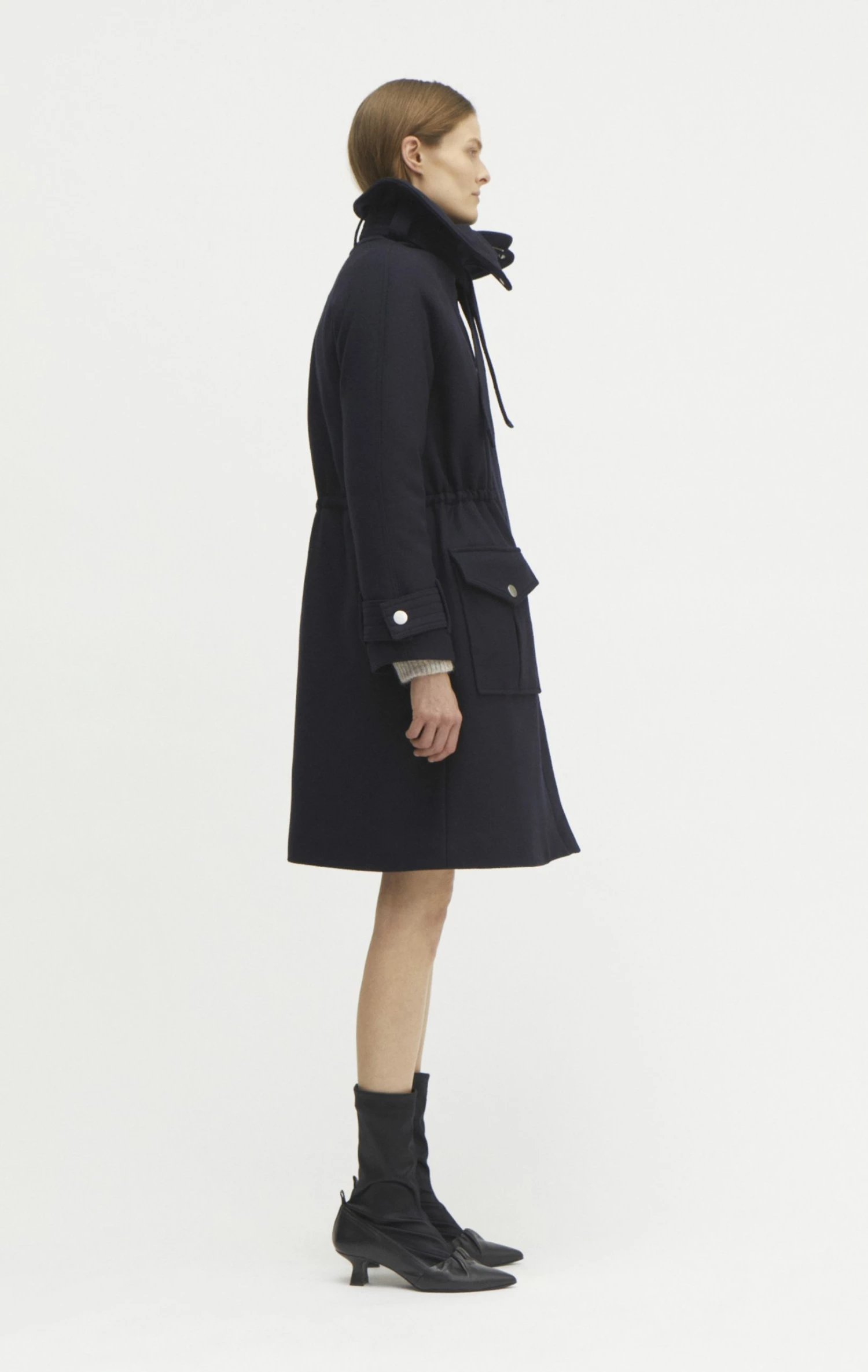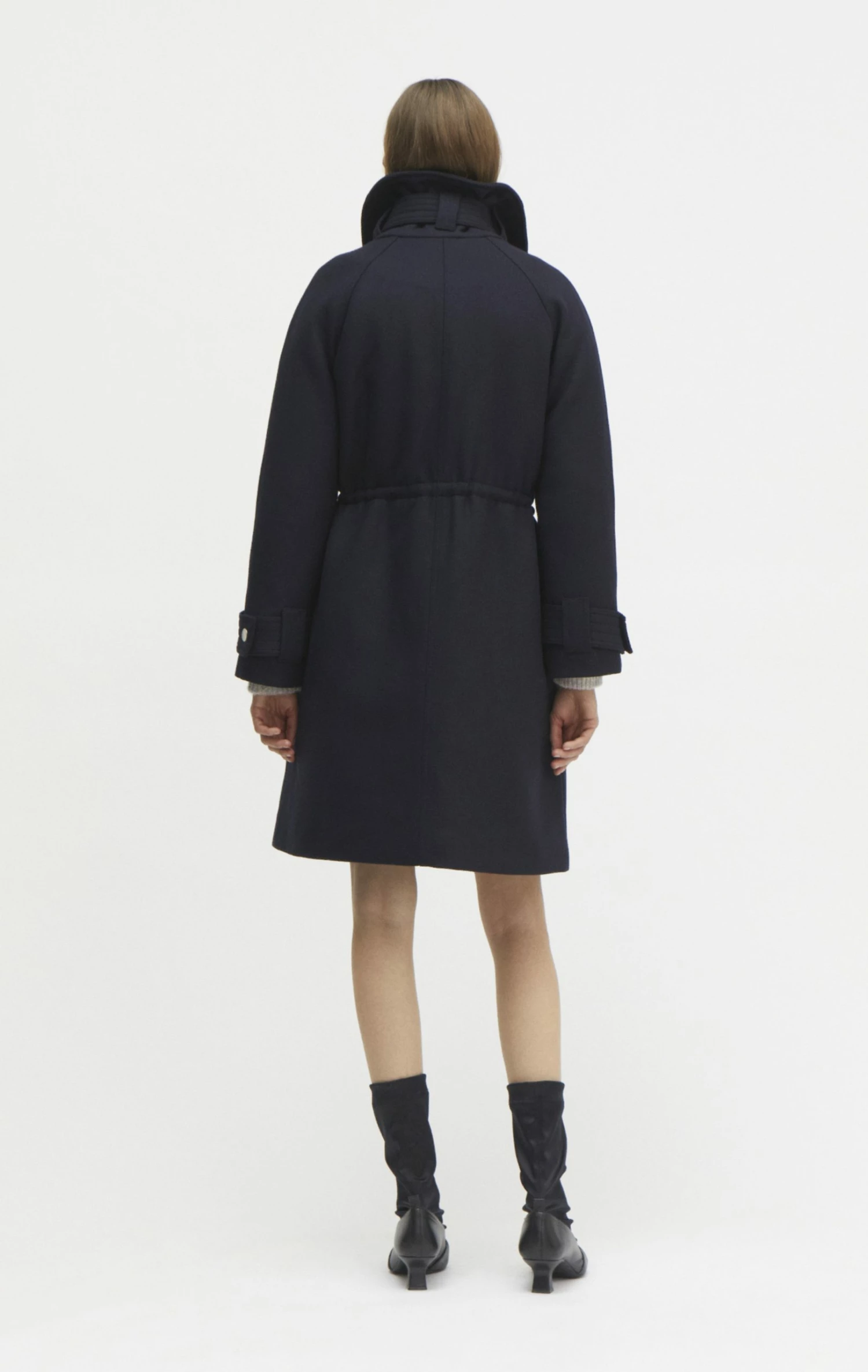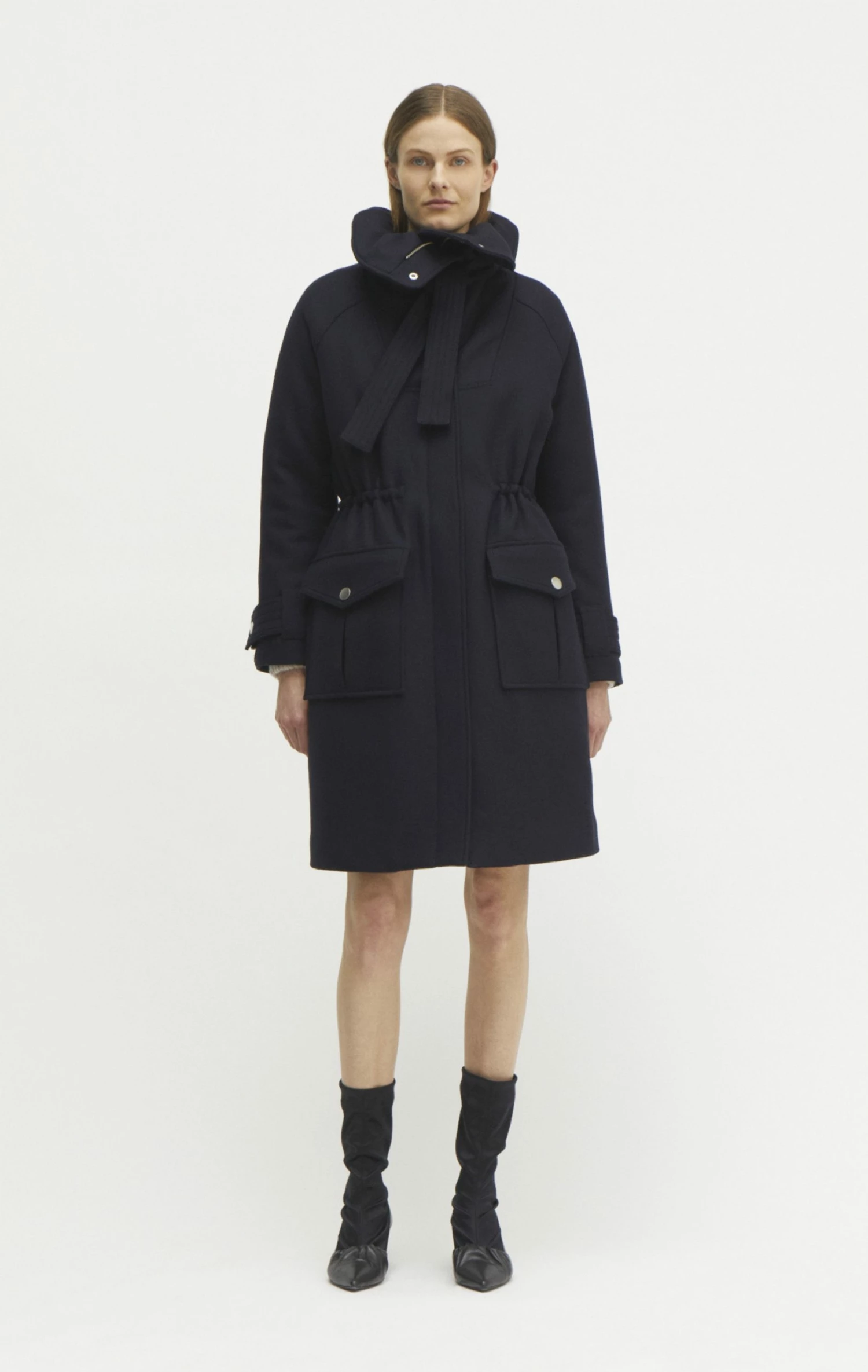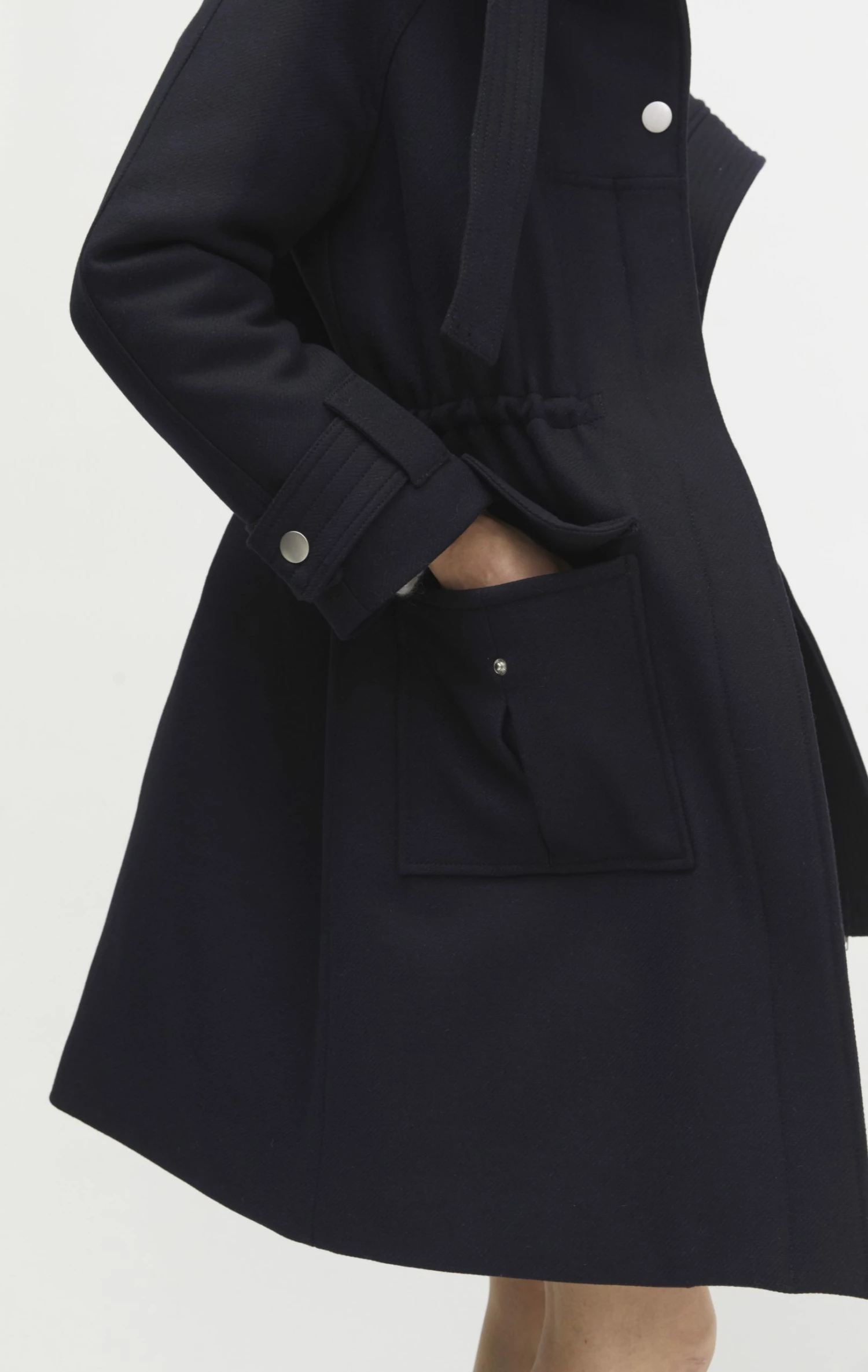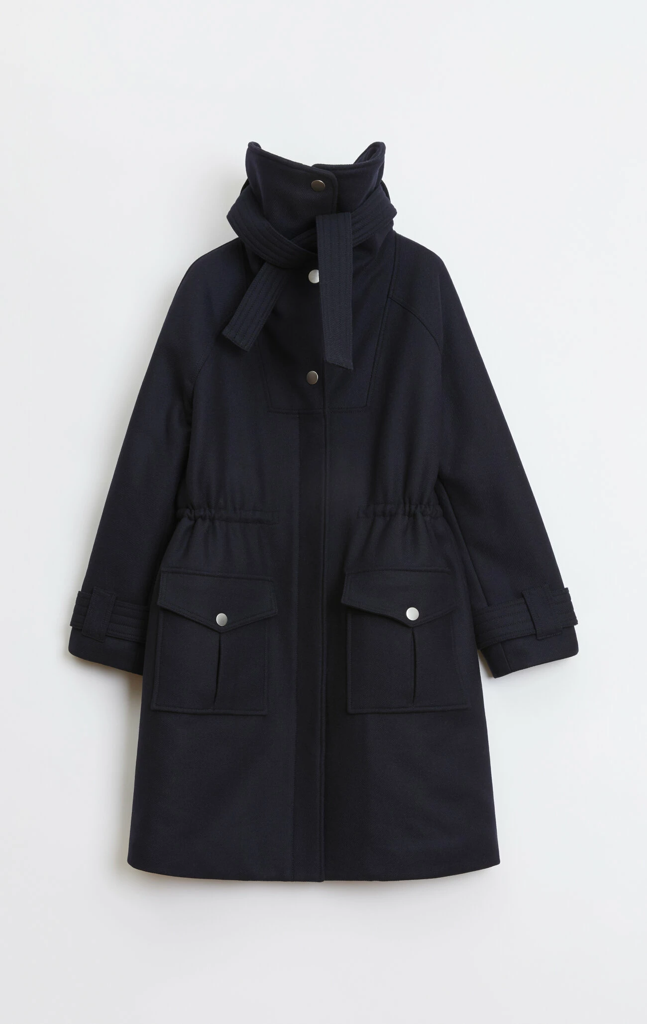 The coat has a big oversized collar with a strap detail on the collar. The strap allows you to tighten the coat around the neck, so that you can really cuddle up in the coat. It has a long raglan sleeve with a strap detail on the sleeve. The coat is made in a relaxed fit on the body and has an adjustable drawstring at the waist. The drawstring allows you to enhance the waistline. At the front it has been decorated with big patched pleat pockets. The pockets has a silver button closure. The coat has a quilted lining, making it nice and warm. The coat has an above the knee length.