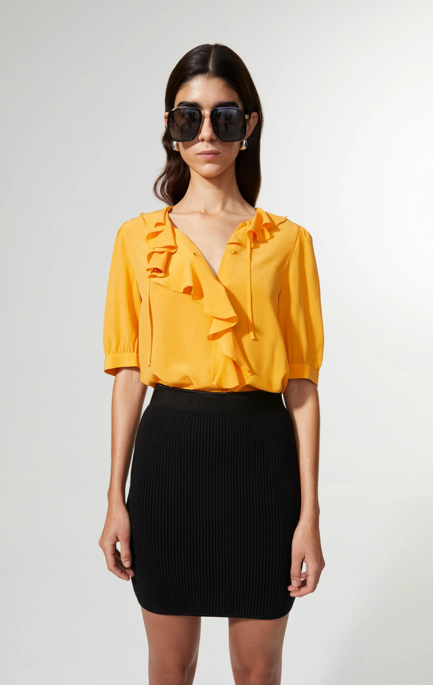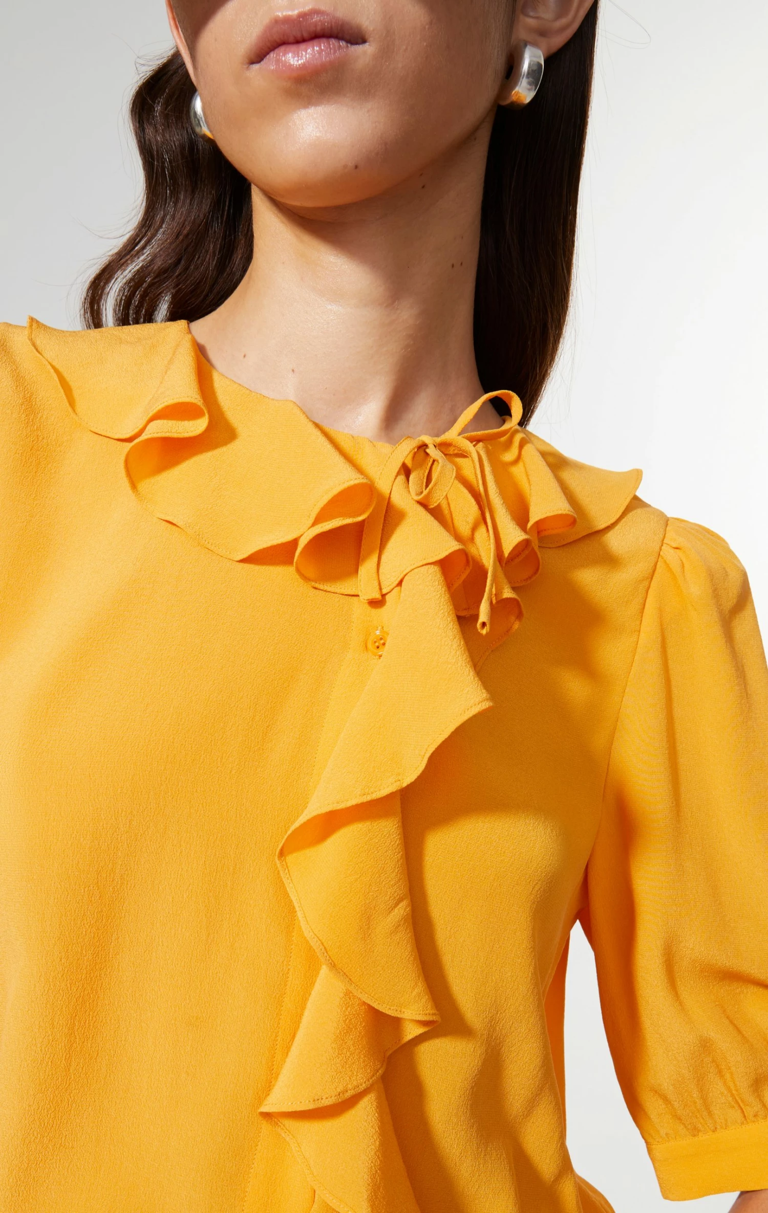The shirt is made in a light silk and has a short straight cut on the body. There is a frill around the neckline both on the front and back that continues along the asymmetric button closure at the front. The elbow length sleeve has a slight puff sleeve effect with a slightly loose cuff.